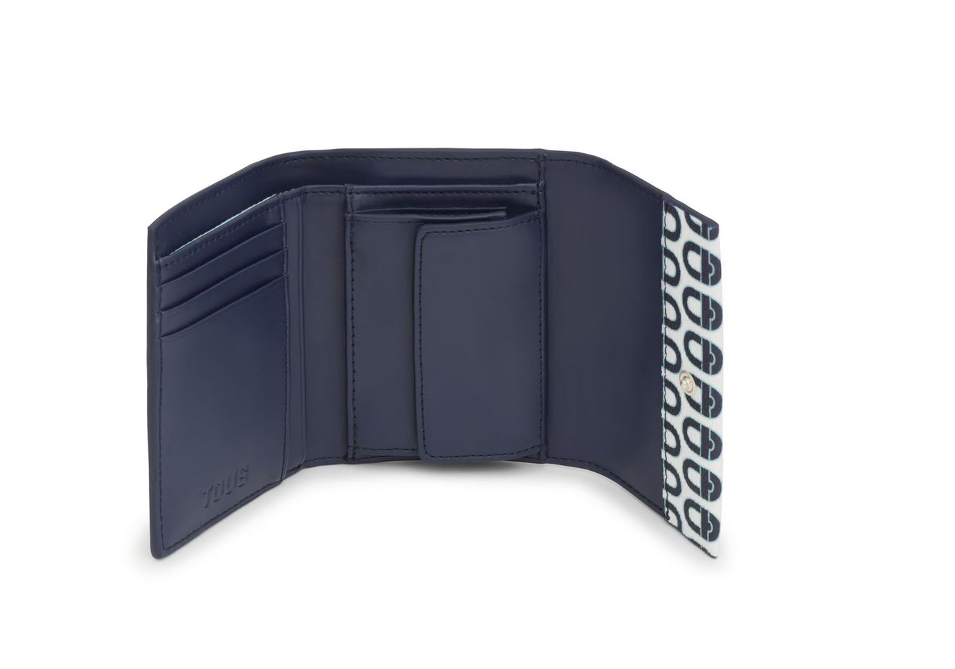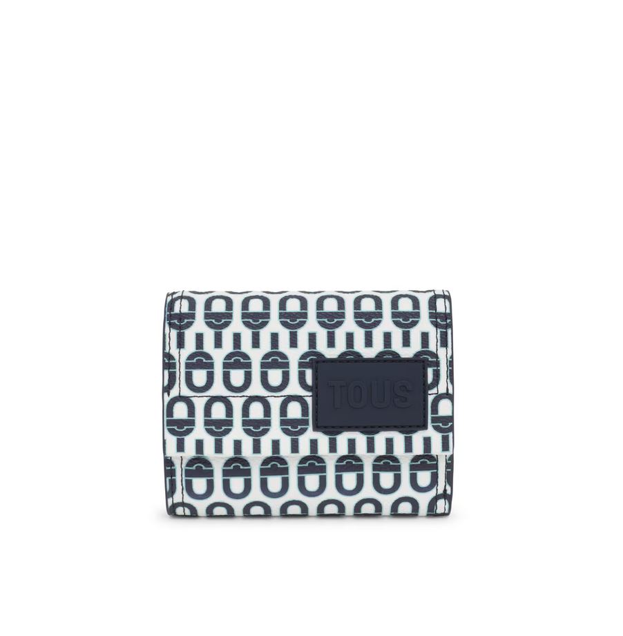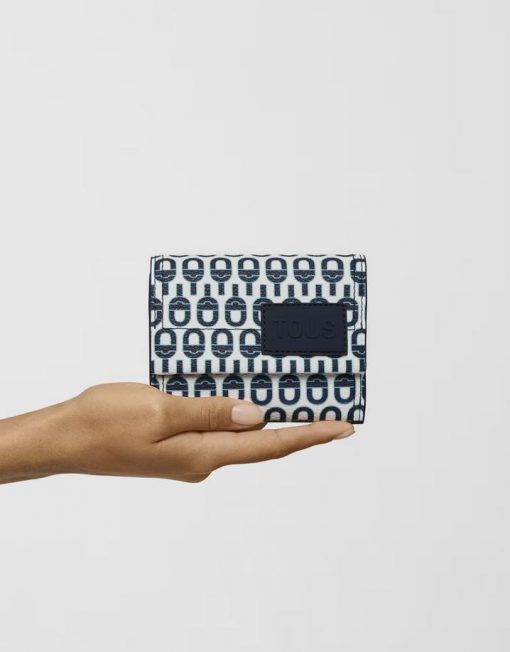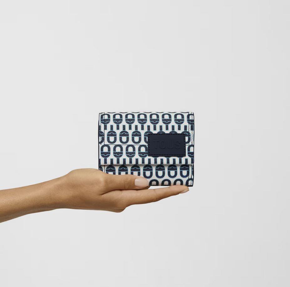 Cartera Flap de lona en color azul marino TOUS MANIFESTO Essence. Cierre de botón a presión. En el interior cuenta con seis ranuras para tarjetas, un bolsillo para monedas con cierre de botón y un espacio abierto para billetes. Medidas (alto x ancho x fondo): 11 x 12 x 3 cm