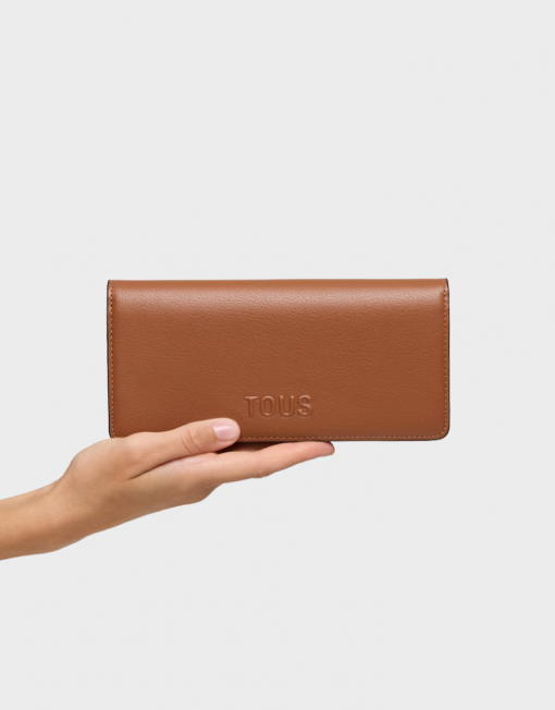 Billetera grande Kaos Icon de poliuretano en color camel. Dispone de dos compartimentos principales. El primero es con cierre de cremallera para monedas. El segundo es con cierre de botón a presión y cuenta con 6 ranuras para tarjetas y 1 departamento abierto para billetes. Medidas (alto x ancho x fondo): 9,5 x 20 x 2 cm.