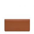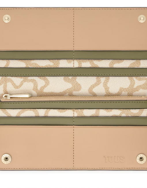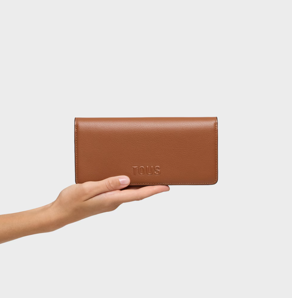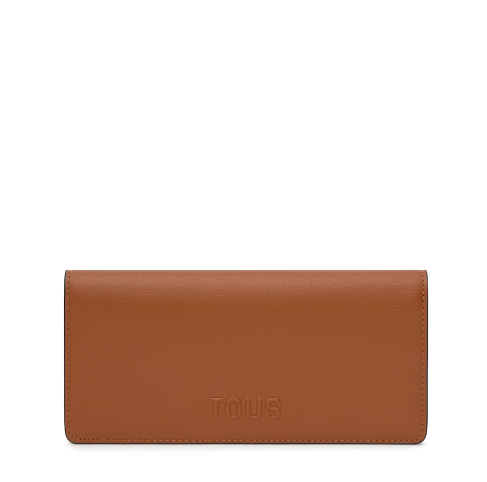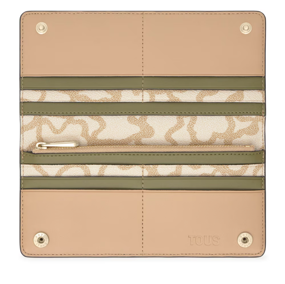 Billetera grande Kaos Icon de poliuretano en color camel. Dispone de dos compartimentos principales. El primero es con cierre de cremallera para monedas. El segundo es con cierre de botón a presión y cuenta con 6 ranuras para tarjetas y 1 departamento abierto para billetes. Medidas (alto x ancho x fondo): 9,5 x 20 x 2 cm.