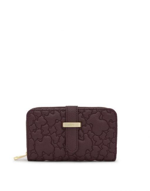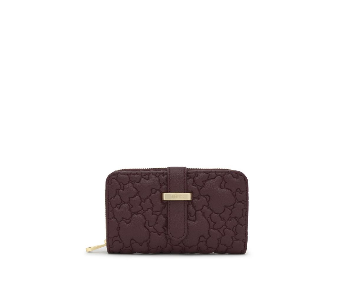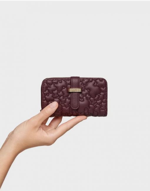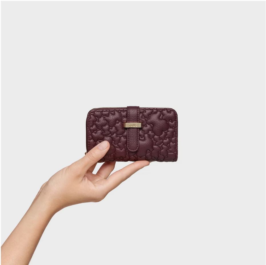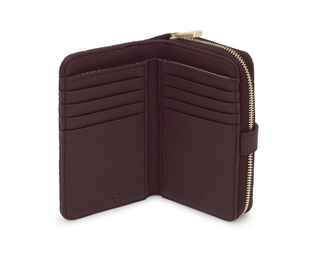 Billetera Bridge Puffy bear de poliuretano en color burdeos. Cierre botón a presión y cremallera. En el interior contiene un compartimento para billetes, ocho ranuras para tarjetas y dos compartimentos para monedas. Medidas (alto x ancho x fondo): 9 x 13,5 x 3 cm.