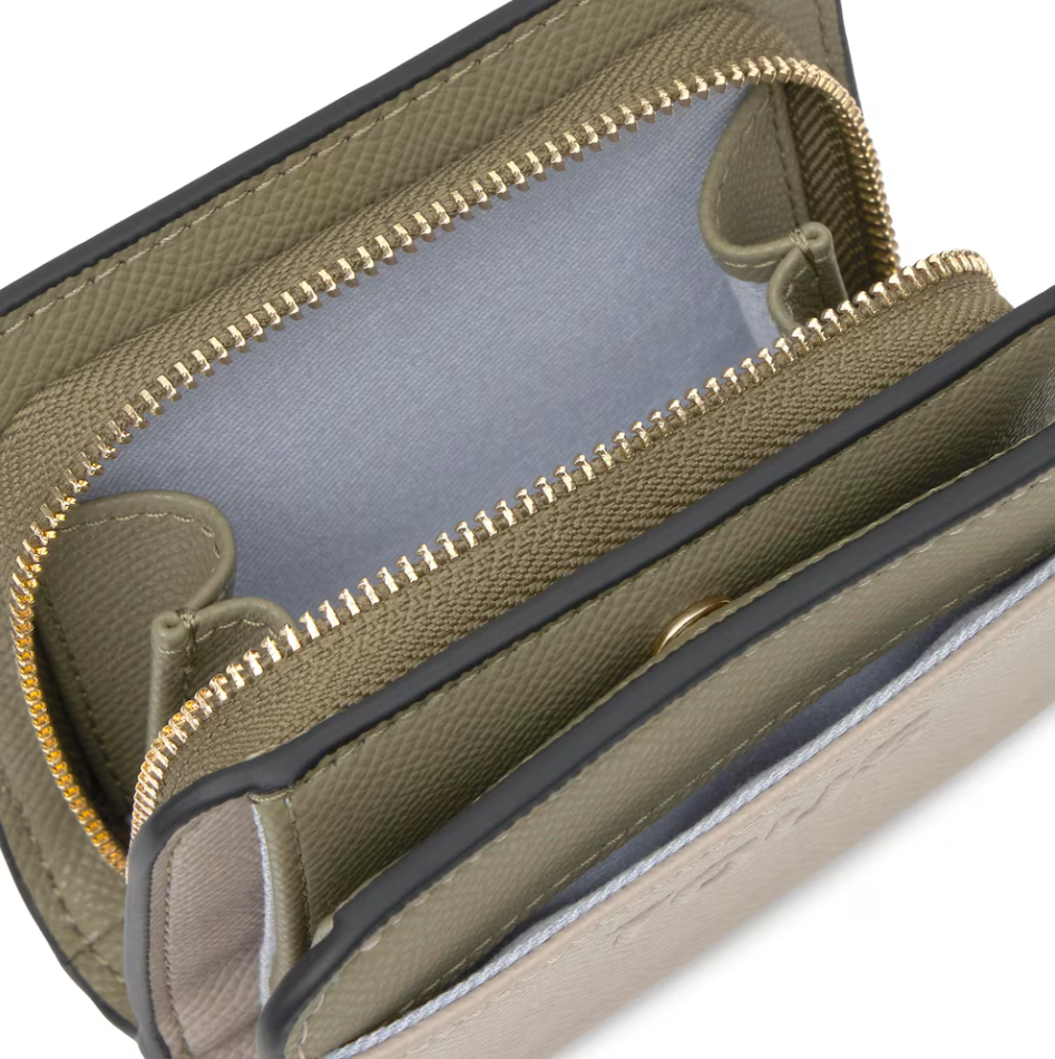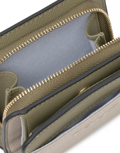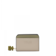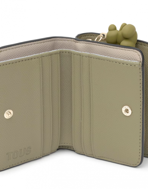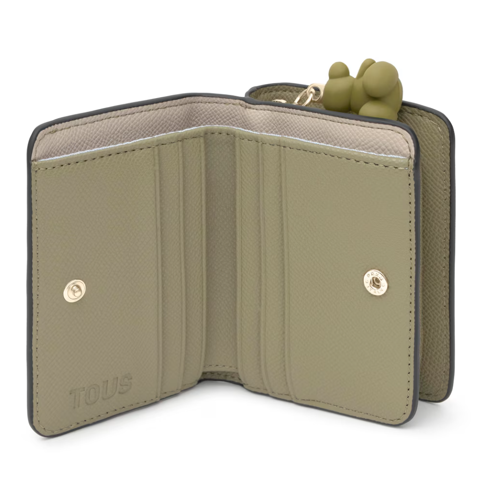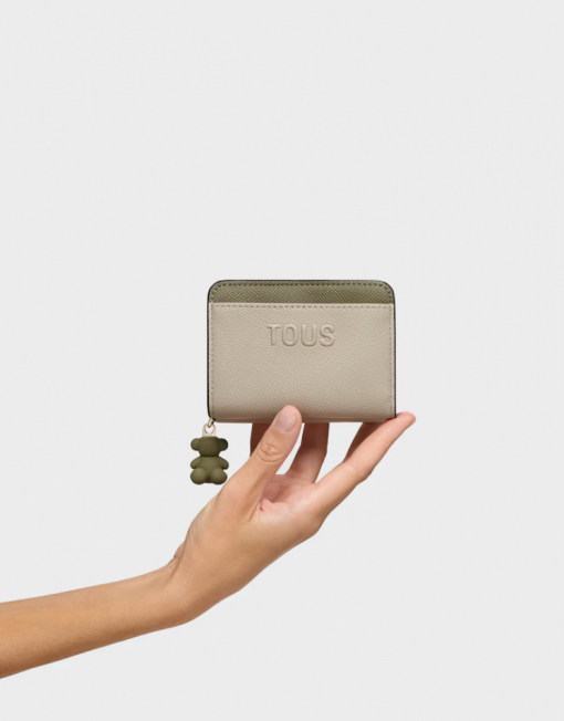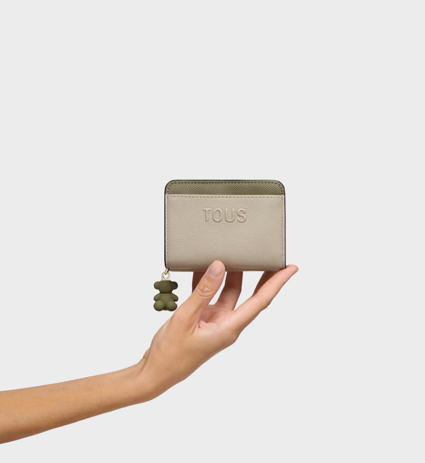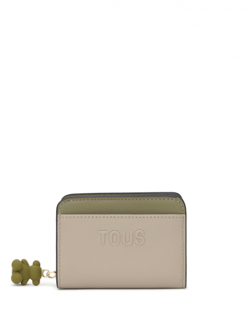 Cartera TOUS Doble Audree Saffiano de poliuretano en color topo y verde. Cierre con botón a presión y cremallera. Dos compartimentos principales: uno con cremallera y otro para tarjetas. Medidas: 8,5 x 11 x 5,5 cm