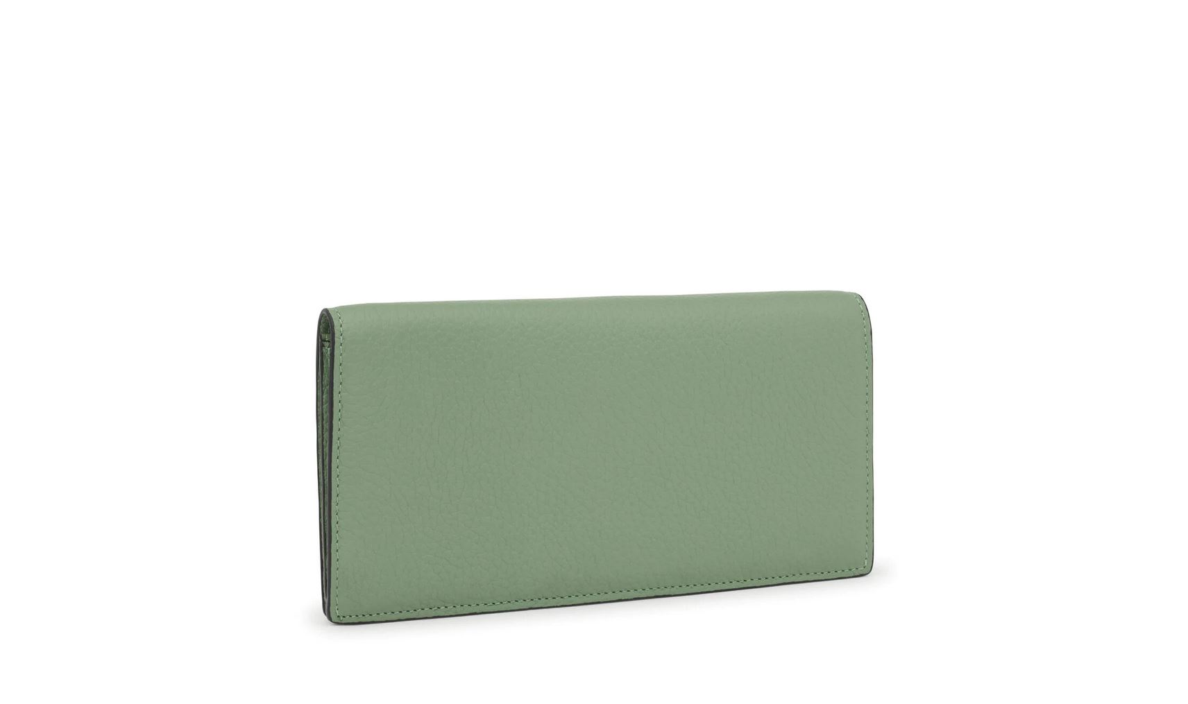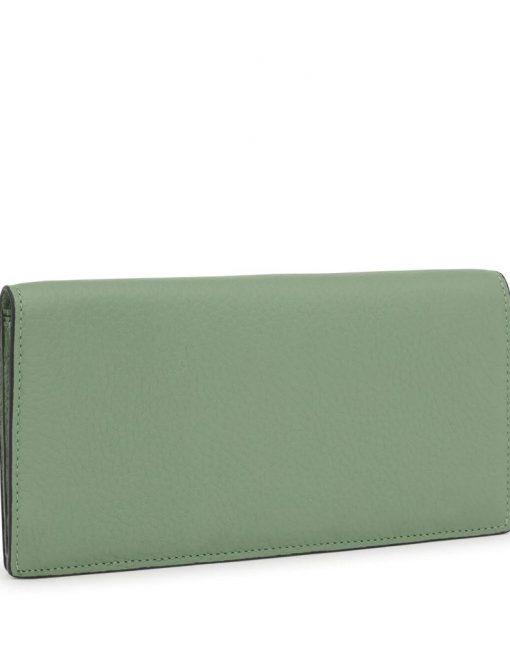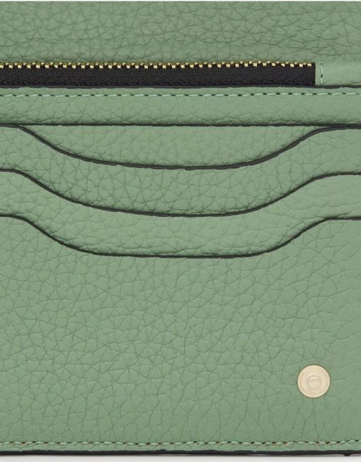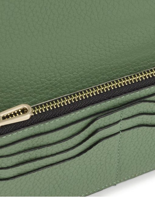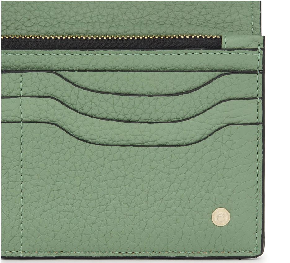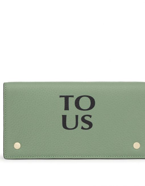 Billetera Flat TOUS Balloon de piel vacuna con certificación LWG en color caqui. Cierre con solapa y dos botones a presión. En el interior cuenta con dos compartimentos abiertos para billetes, un bolsillo con cremallera para monedas y 6 ranuras para tarjetas. Medidas (alto x ancho x fondo): 10 x 19,5 x 2 cm.