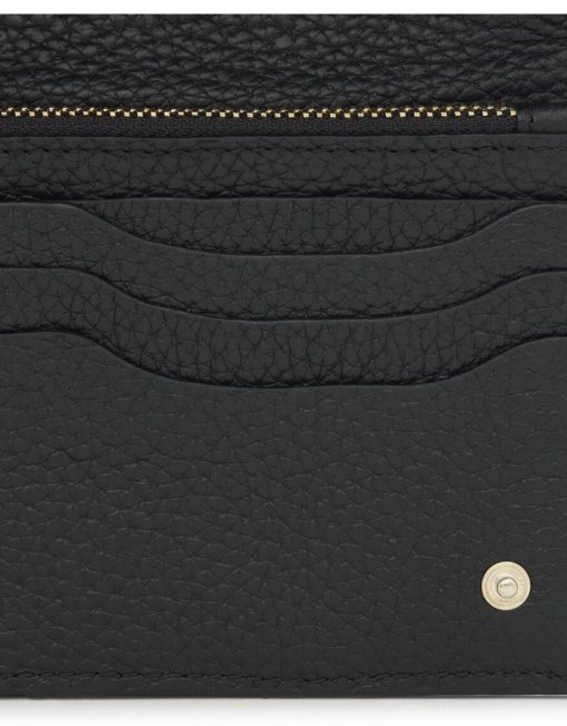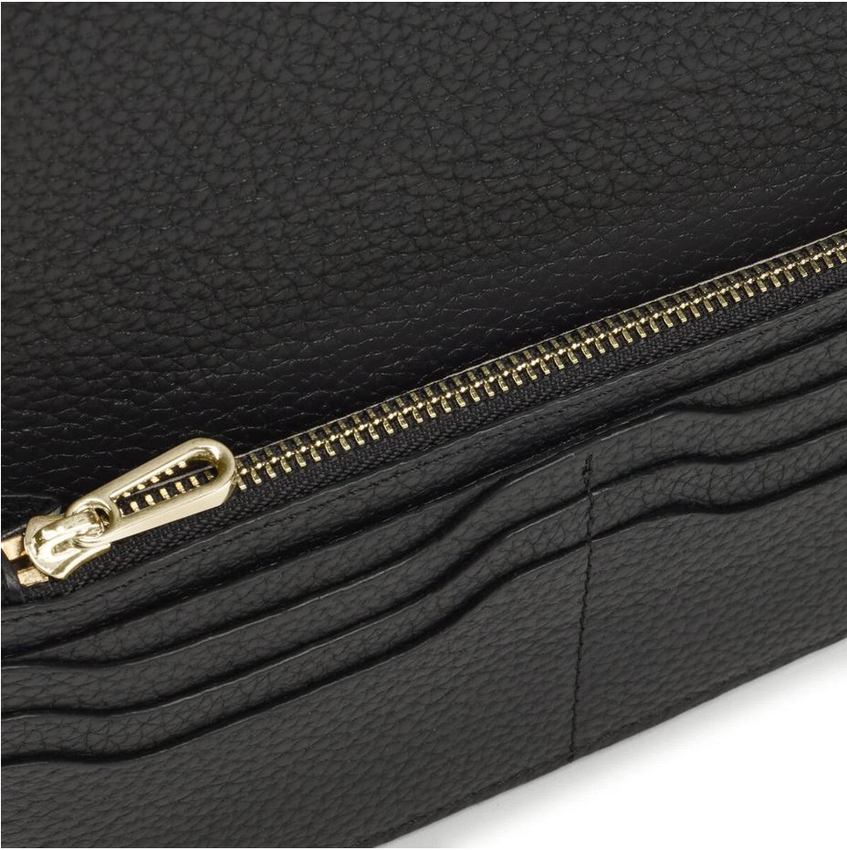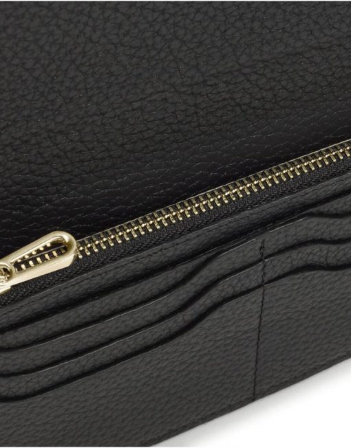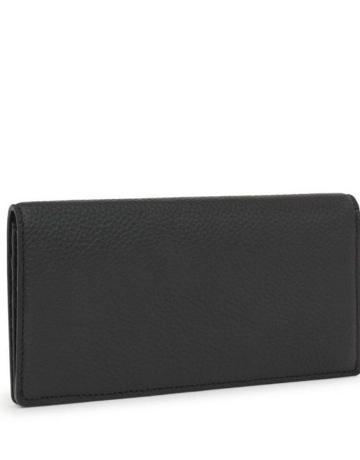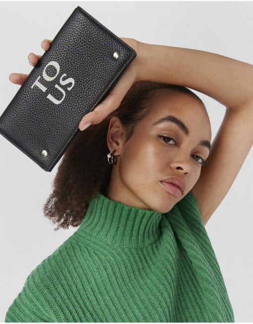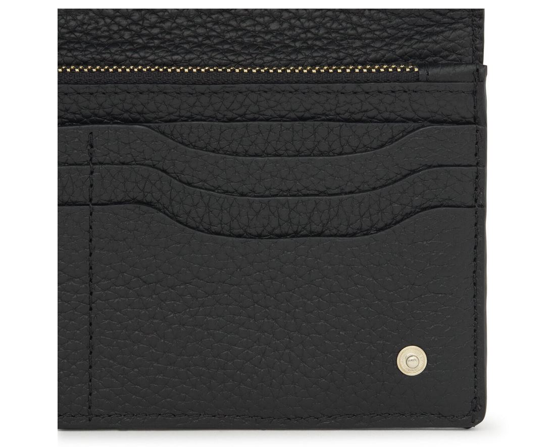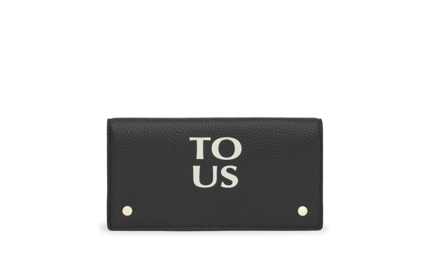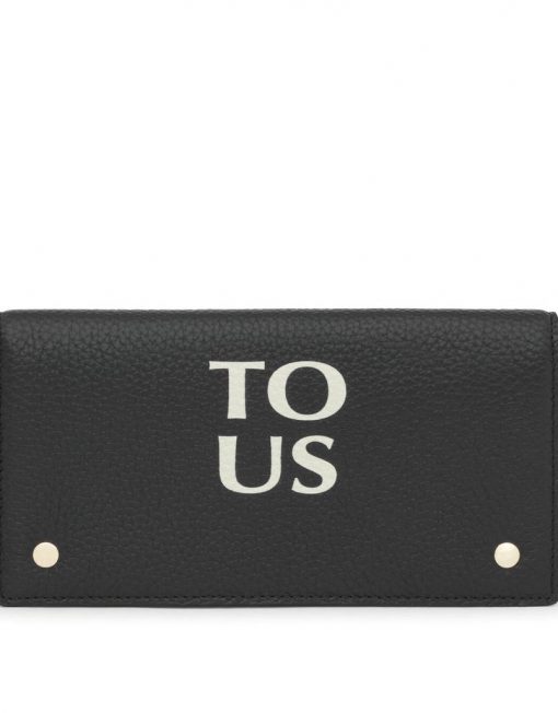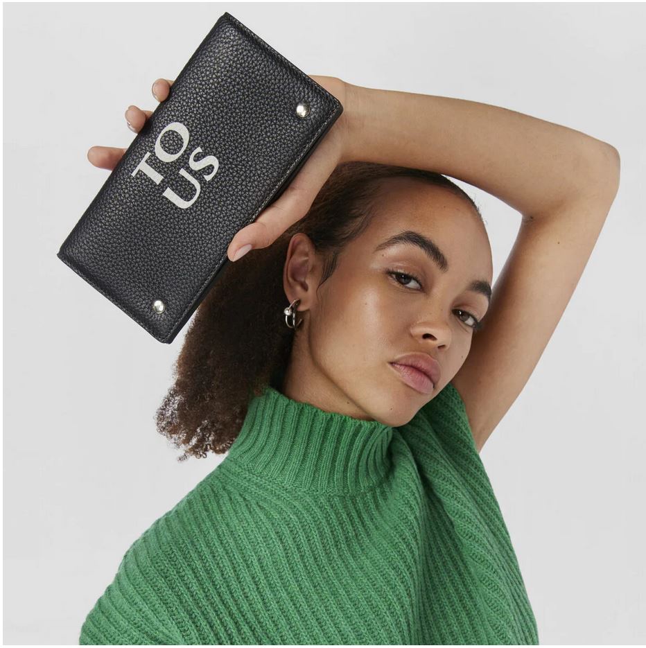 Billetera Flat TOUS Balloon de piel vacuna con certificación LWG en color negro. Cierre con solapa y dos botones a presión. En el interior cuenta con dos compartimentos abiertos para billetes, un bolsillo con cremallera para monedas y 6 ranuras para tarjetas. Medidas (alto x ancho x fondo): 10 x 19,5 x 2 cm.