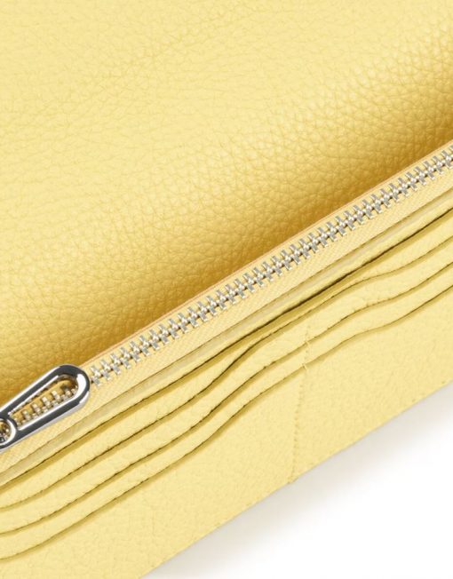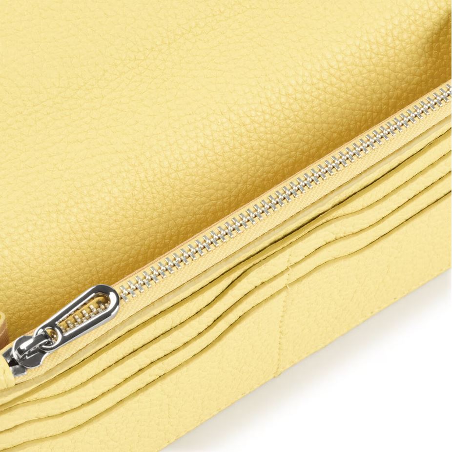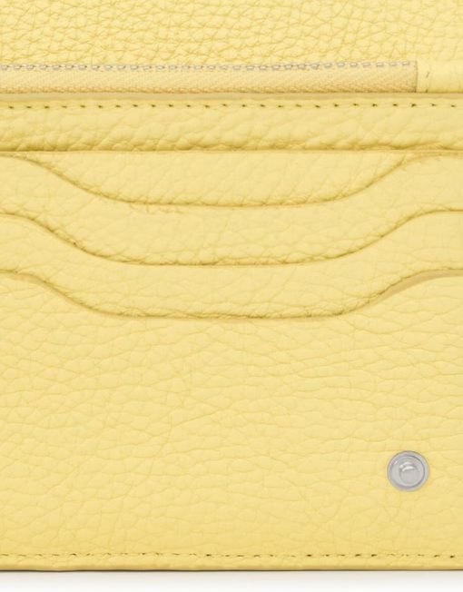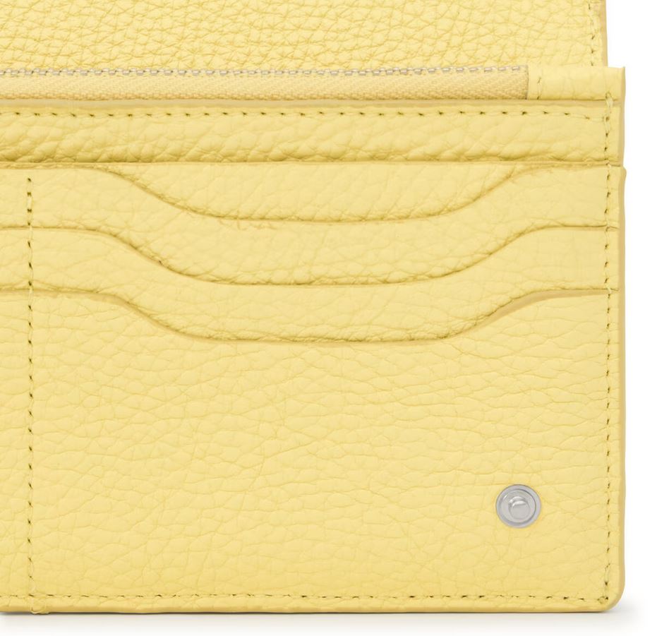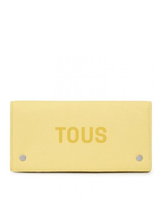 Billetera Flat TOUS Balloon de piel vacuna con certificación LWG en color amarillo. Cierre con solapa y dos botones a presión. En el interior cuenta con dos compartimentos abiertos para billetes, un bolsillo con cremallera para monedas y 6 ranuras para tarjetas. Medidas (alto x ancho x fondo): 10 x 19,5 x 2 cm.