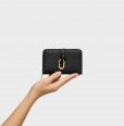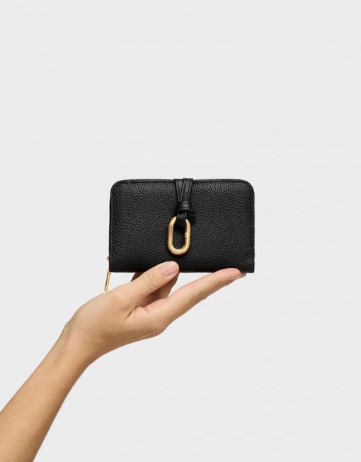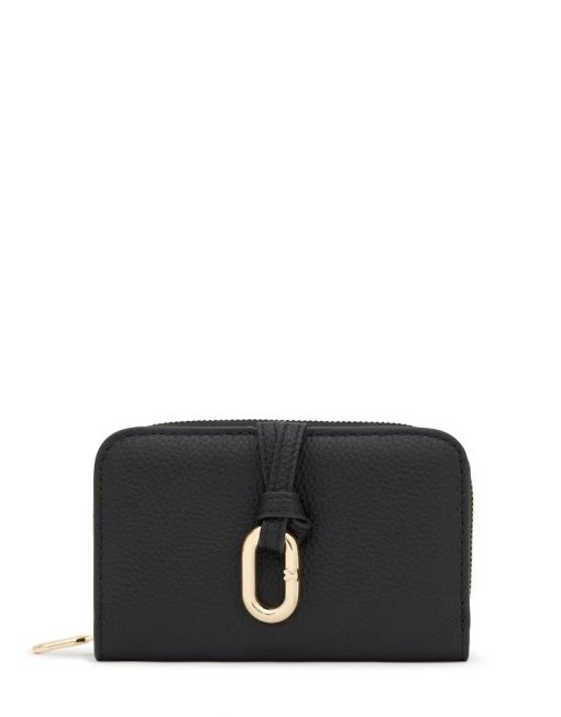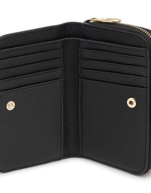 Billetera TOUS Hold de piel vacuna con certificación LWG en color negra. Cierre de botón a presión. Tiene un compartimento para monedas con cierre de cremallera. En el interior cuenta con ocho ranuras para tarjetas y dos espacios para billetes. Medidas (alto x ancho x fondo): 8 x 13,5 x 3,5 cm.
