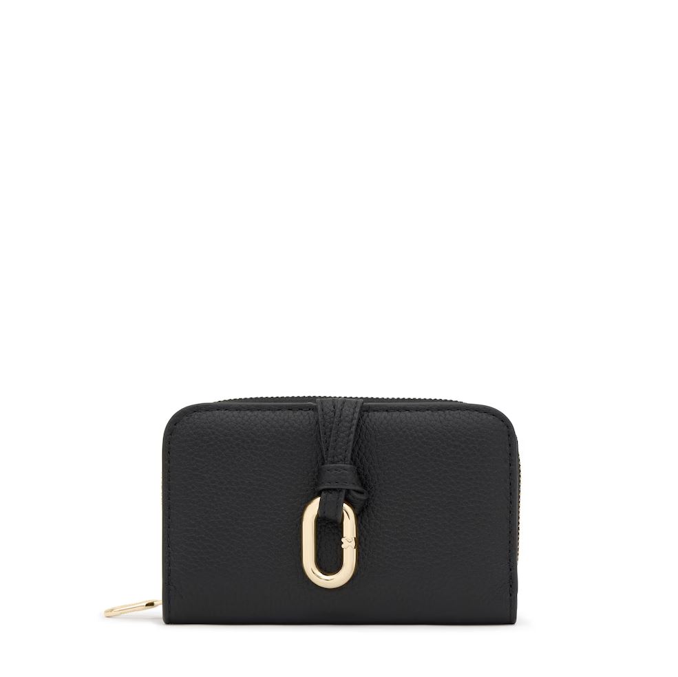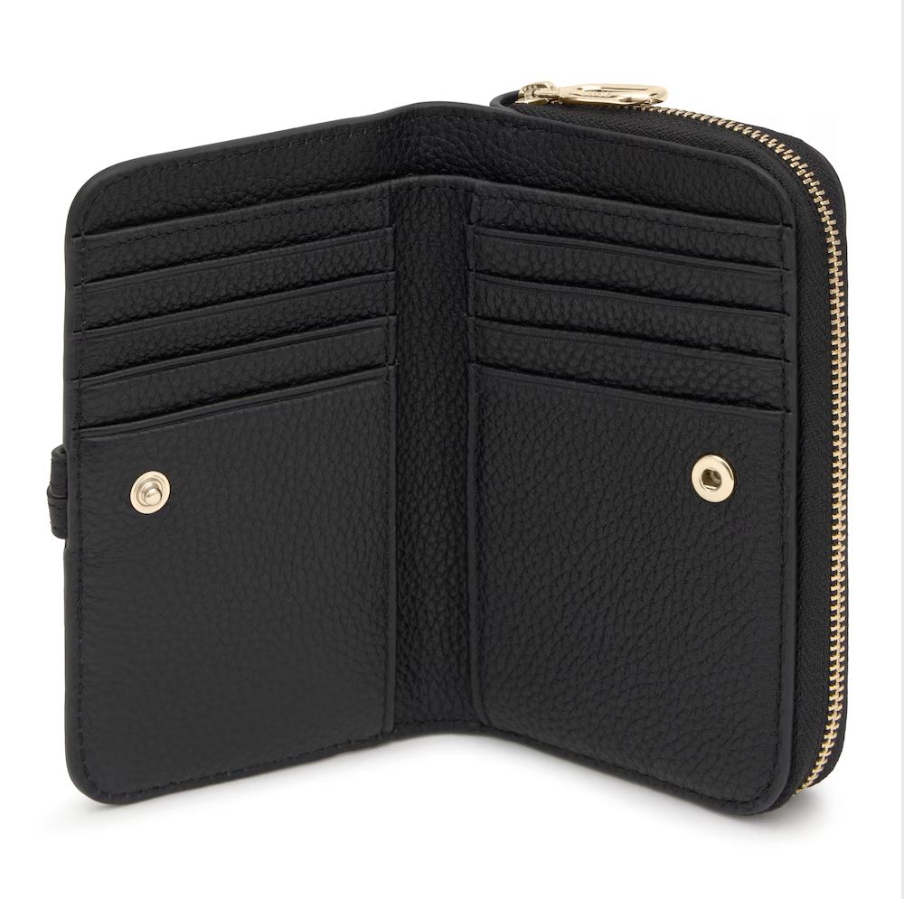 Billetera TOUS Hold de piel vacuna con certificación LWG en color negra. Cierre de botón a presión. Tiene un compartimento para monedas con cierre de cremallera. En el interior cuenta con ocho ranuras para tarjetas y dos espacios para billetes. Medidas (alto x ancho x fondo): 8 x 13,5 x 3,5 cm.