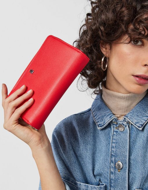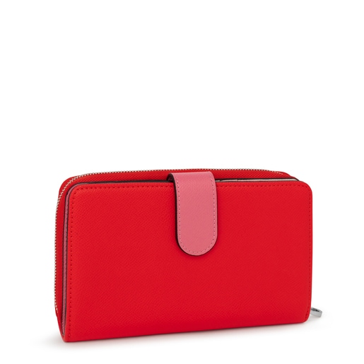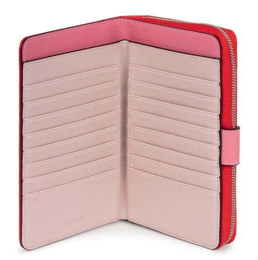 Billetera mediana TOUS de la colección New Dubai Saffiano de piel sintética Saffiano en color rojo, rosa y rosa pálido. Dispone de dos compartimentos principales. El primero es con cierre de cremallera y cuenta con 3 departamentos abiertos para monedas. El segundo es con cierre de botón a presión y cuenta con 3 bolsillos abiertos para billetes y 16 ranuras para tarjetas. Medidas (alto x ancho x fondo): 19 x 12 x 4 cm.