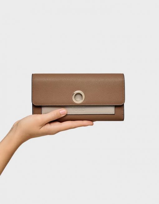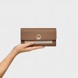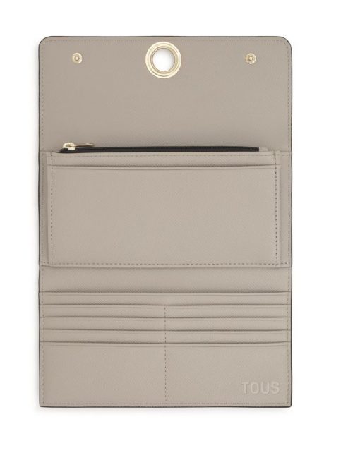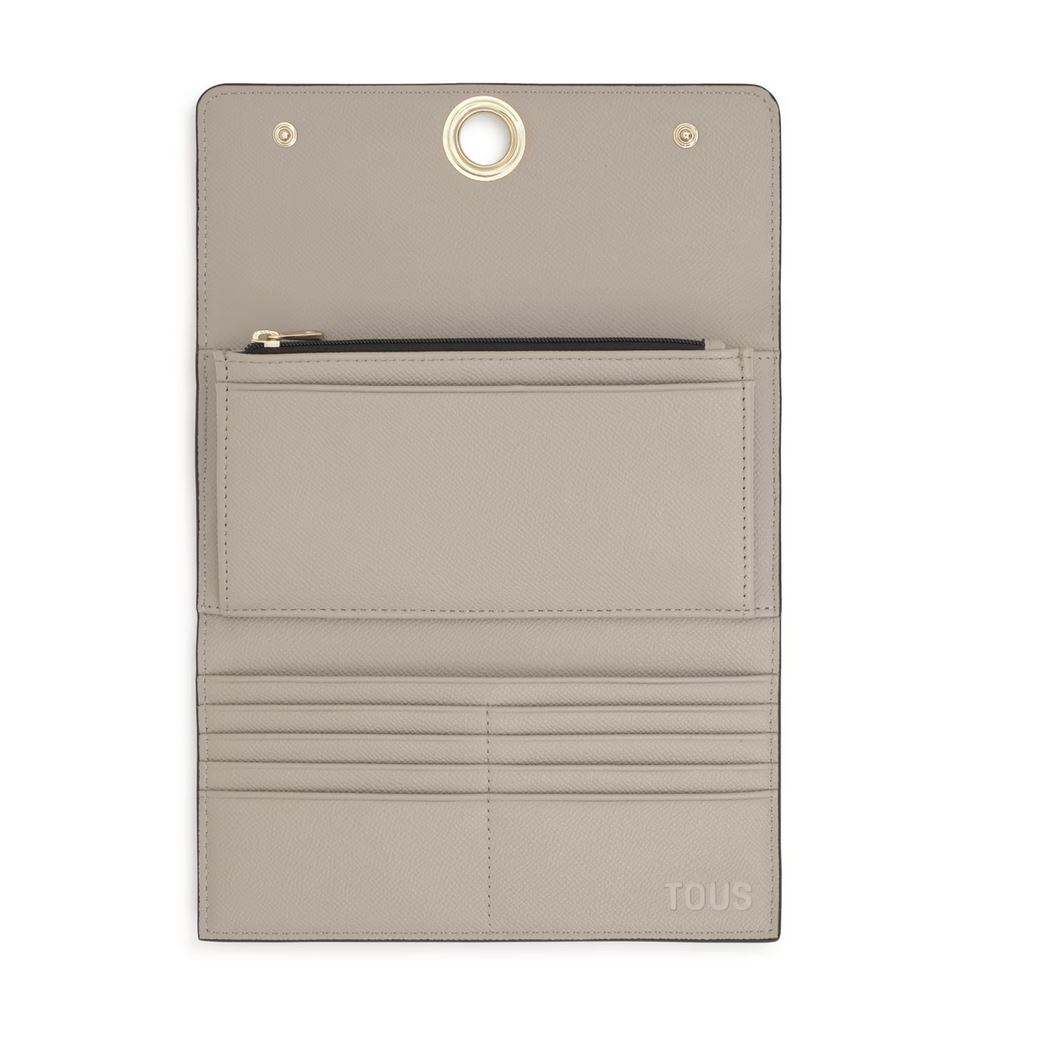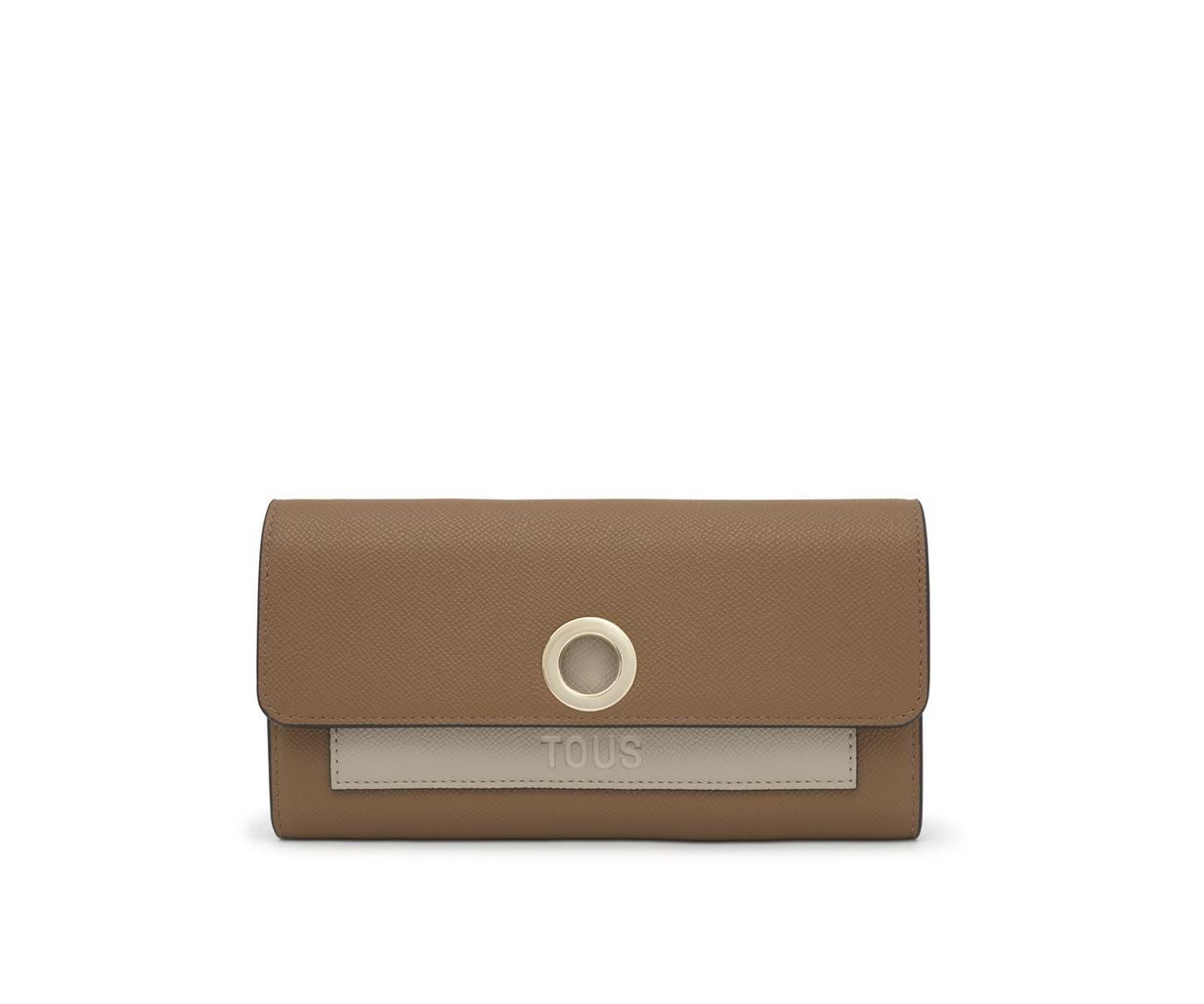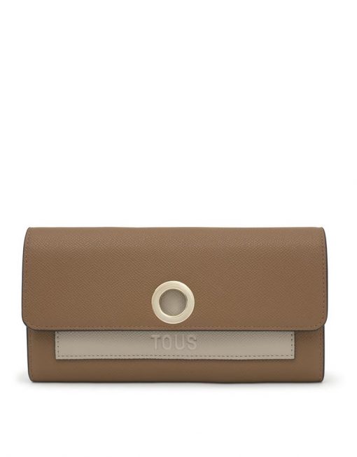 Billetera TOUS Poppy de poliuretano en color tierra. Cierre de botones a presión. En el interior contiene ocho ranuras para tarjetas, un compartimento para monedas con cierre de cremallera y tres compartimentos para billetes. Bolsillo abierto en la parte delantera. Medidas (alto x ancho x fondo): 10,8 x 20 x 2 cm.