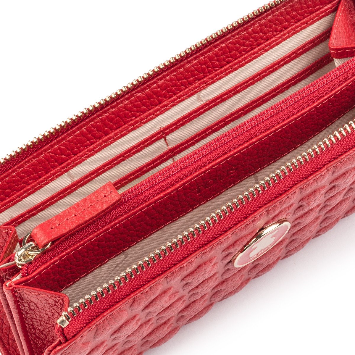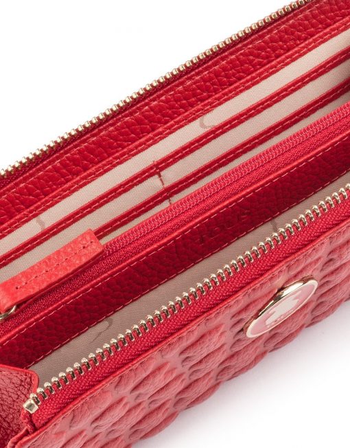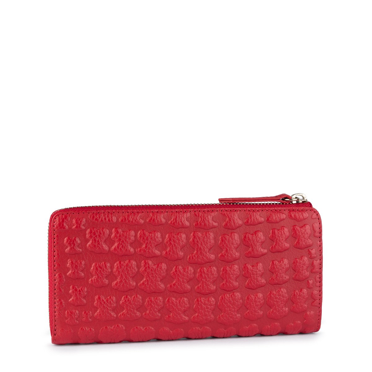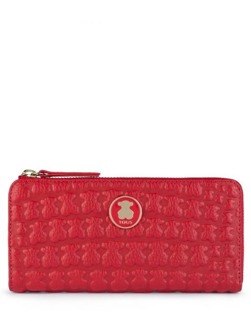 Billetero mediano TOUS Sherton de piel grabada con oso simulando efecto cocodrilo en color rojo. Cierre con cremallera. Interior: ocho departamentos para tarjetas, un departamento con cremallera y cuatro departamentos para varios. Medidas: 10x19x2 cm.