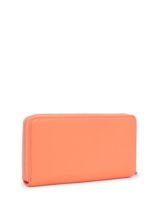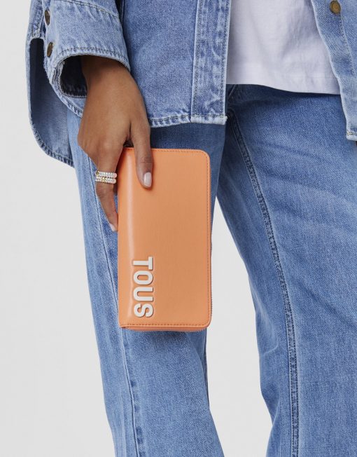 Billetera TOUS Carol de piel sintética en color naranja con cierre de cremallera. En el interior cuenta con dos compartimentos abiertos para billetes, un bolsillo central con cremallera para monedas y 8 ranuras para tarjetas. Medidas (alto x ancho x fondo): 10 x 19,5 x 2,5 cm.