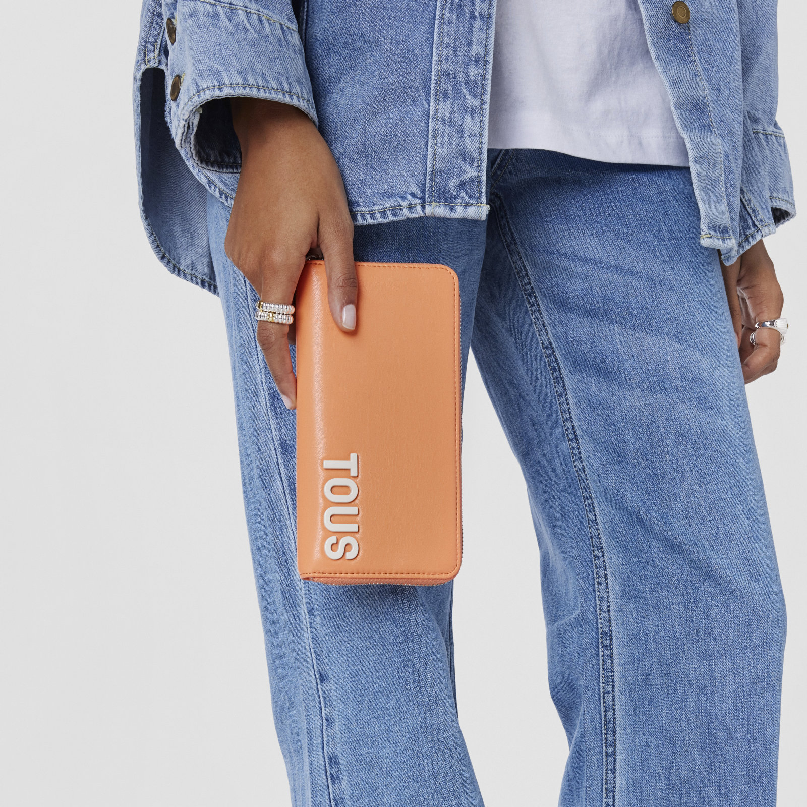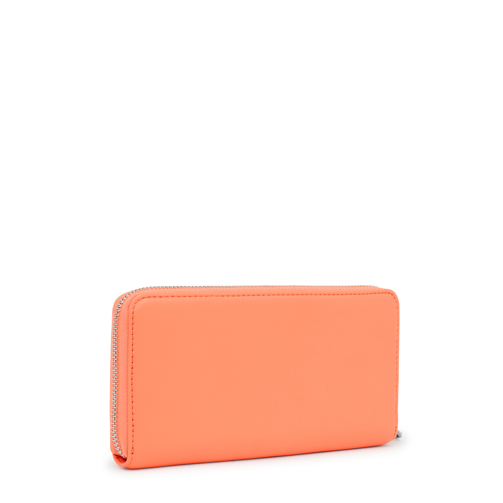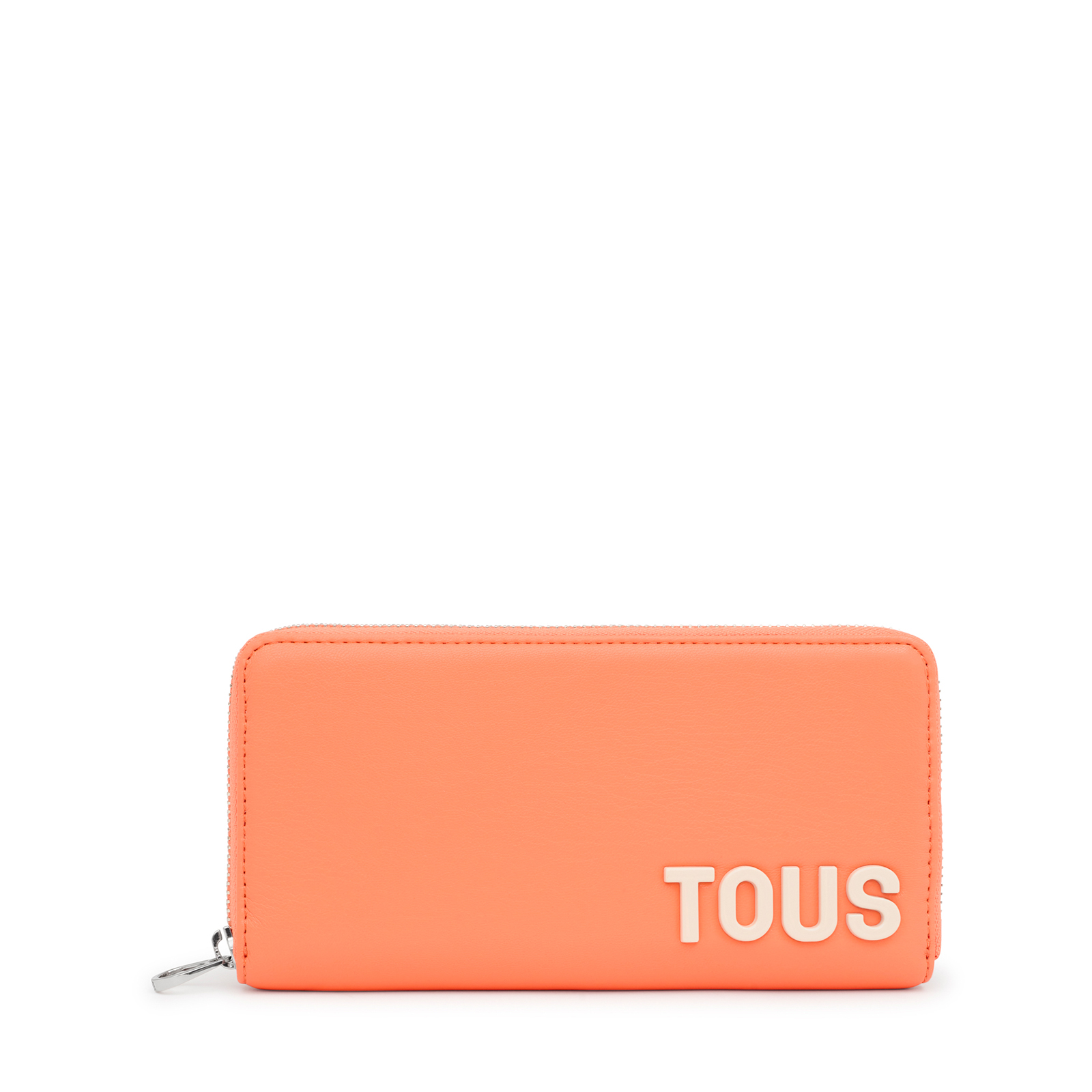 Billetera TOUS Carol de piel sintética en color naranja con cierre de cremallera. En el interior cuenta con dos compartimentos abiertos para billetes, un bolsillo central con cremallera para monedas y 8 ranuras para tarjetas. Medidas (alto x ancho x fondo): 10 x 19,5 x 2,5 cm.
