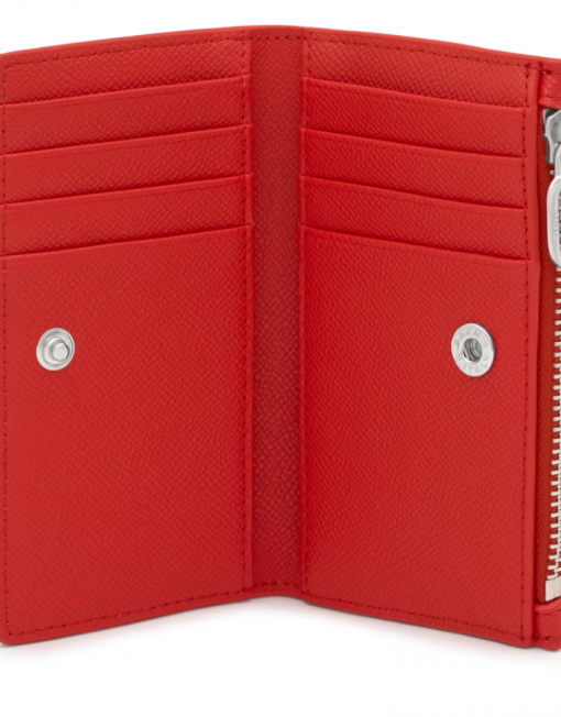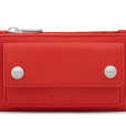 Cartera Audree Pockets de poliuretano en color rojo. Cierre con botón a presión. Tiene un compartimento para monedas con cierre de cremallera. En el interior cuenta con ocho ranuras para tarjetas y dos espacios para billetes. Medidas (alto x ancho x fondo): 8,5 x 14 x 3,5 cm