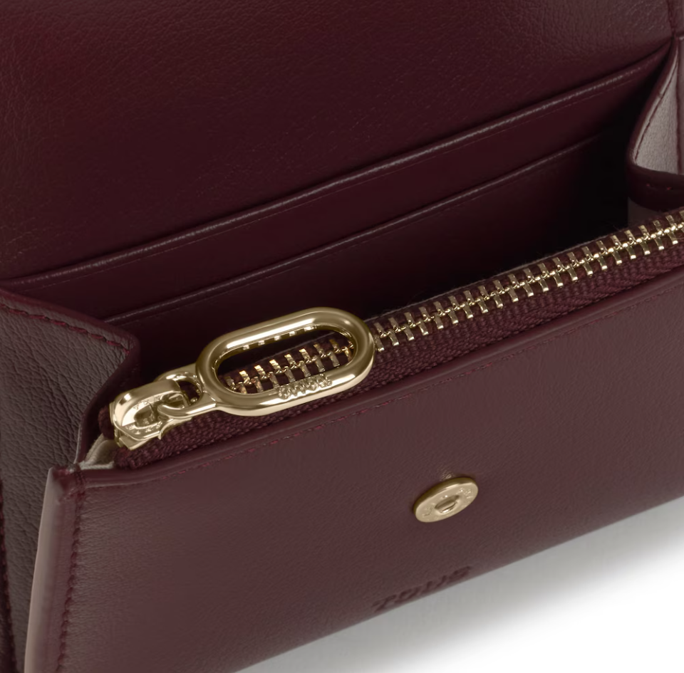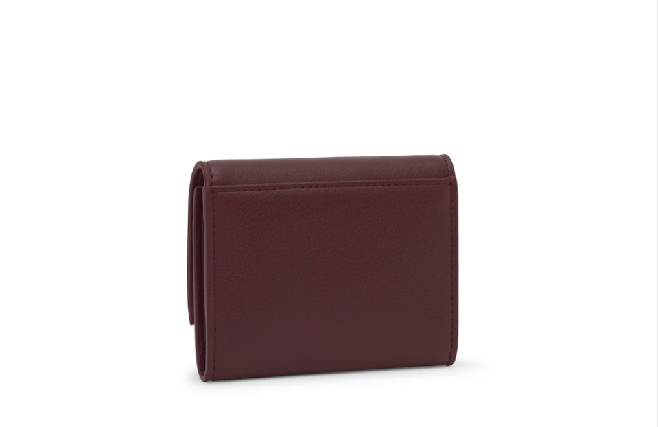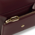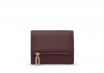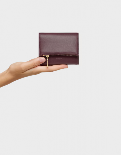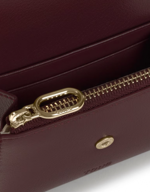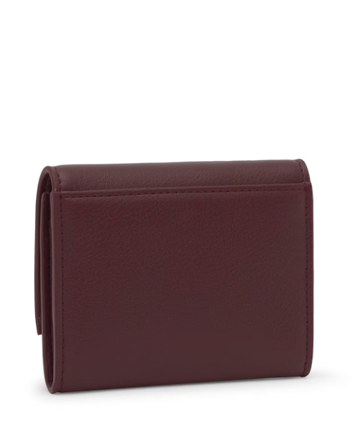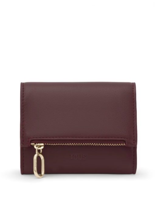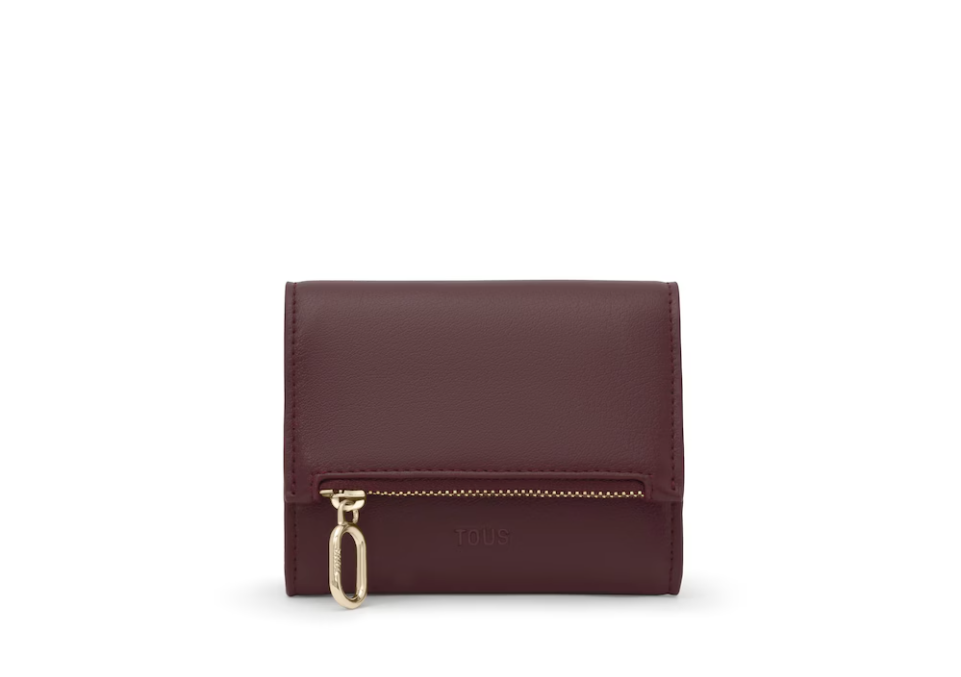 Cartera TOUS City de poliuretano en color burdeos. Cierre con botón a presión. Contiene un compartimento abierto y dos con cremallera. Medidas (alto x ancho x fondo): 11 x 8,5 x 2,5 cm