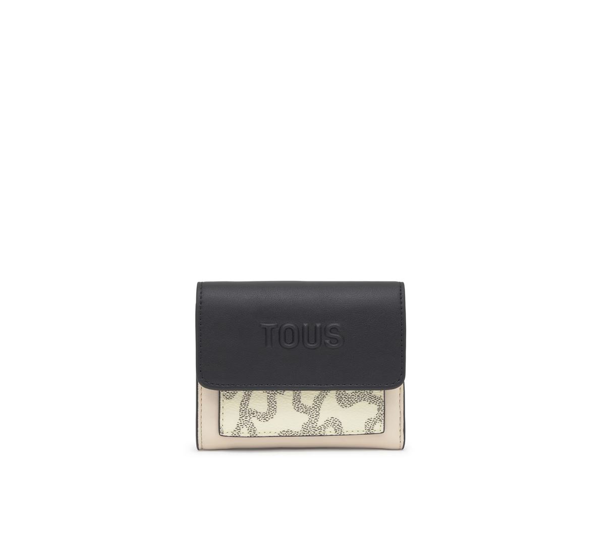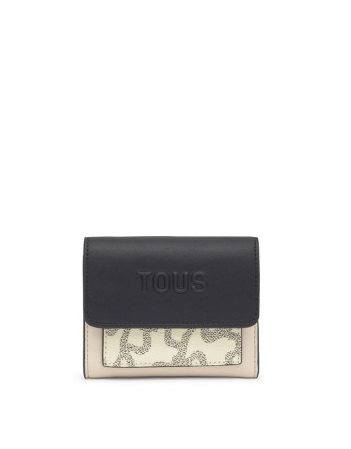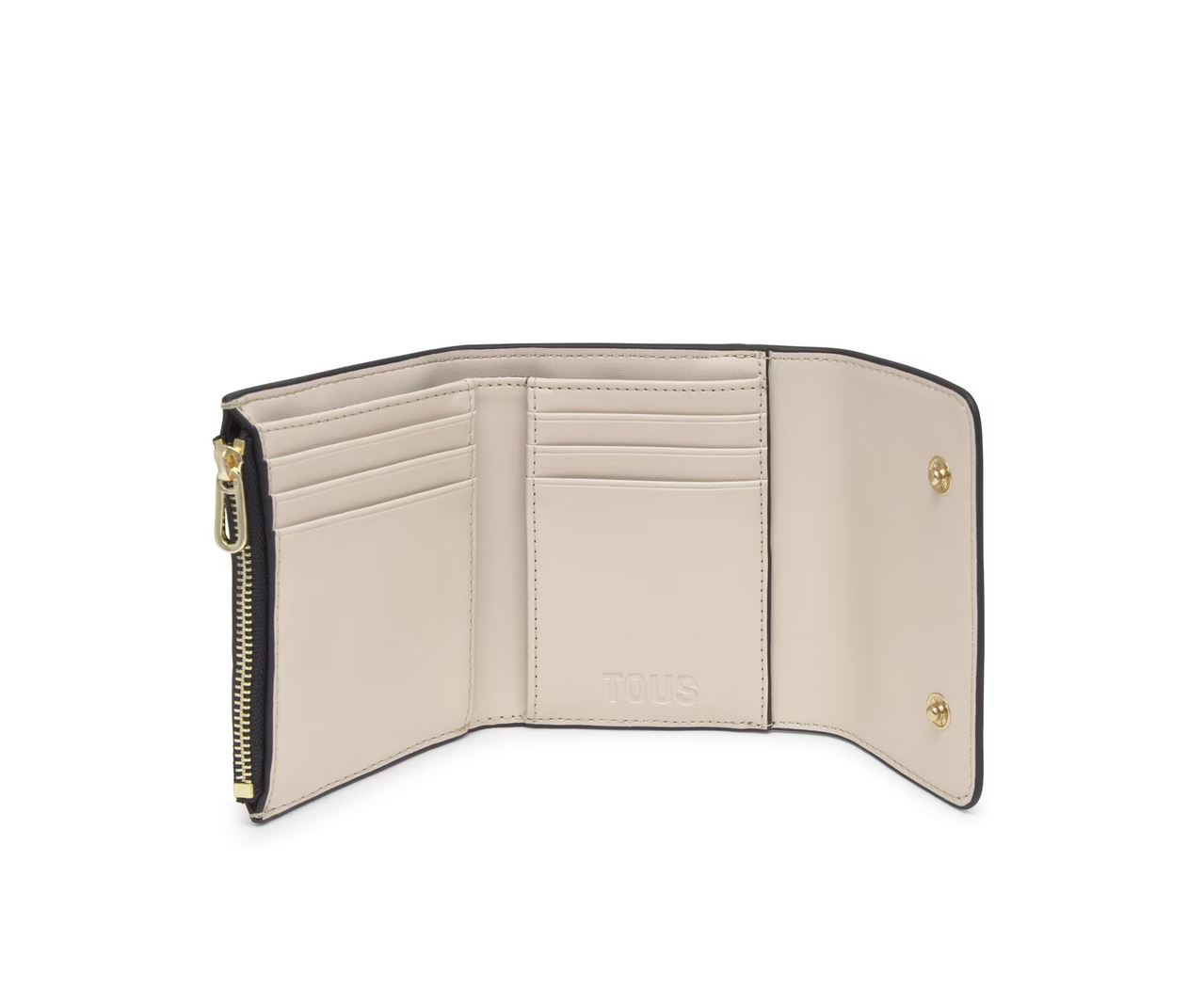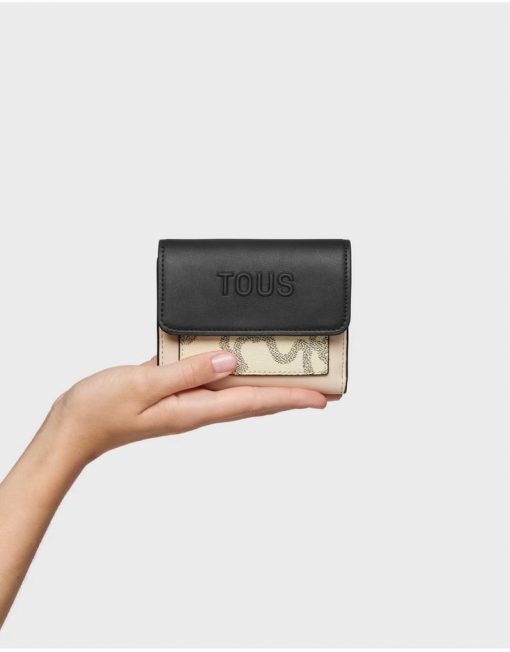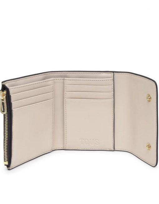 Cartera Kaos Icon de poliuretano en color beige. Cierre de botones a presión. En el interior cuenta con seis ranuras para tarjetas y un compartimento para billetes. Bolsillo para monedas con cierre de cremallera. Medidas (alto x ancho x fondo): 10 x 12 x 3 cm.