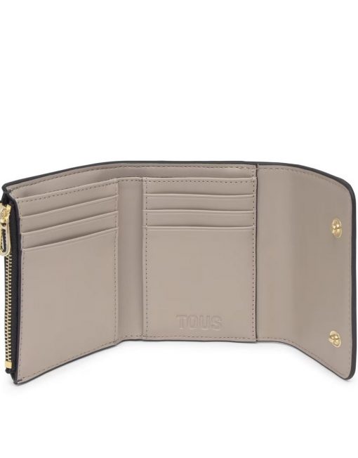 Cartera Kaos Icon de poliuretano en color gris oscuro. Cierre de botones a presión. En el interior cuenta con seis ranuras para tarjetas y un compartimento para billetes. Bolsillo para monedas con cierre de cremallera. Medidas (alto x ancho x fondo): 10 x 12 x 3 cm.