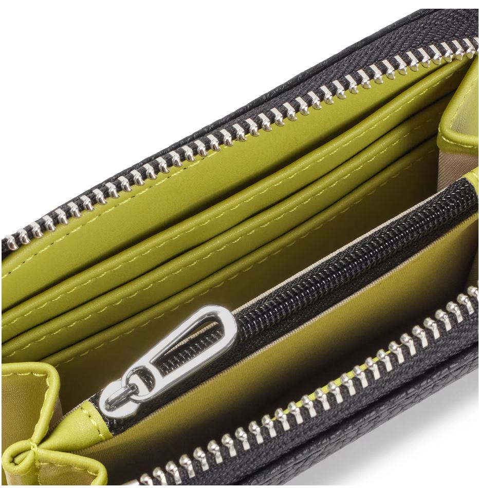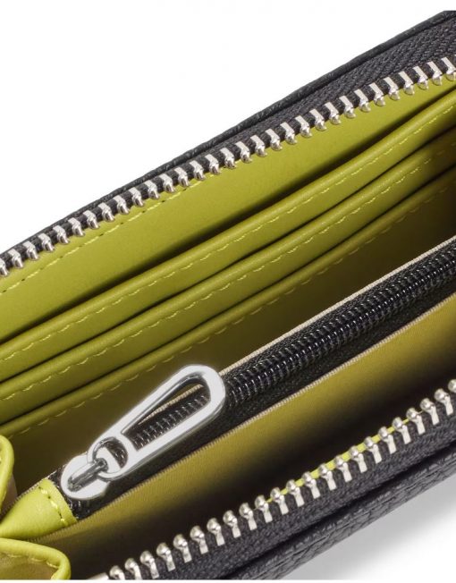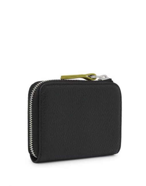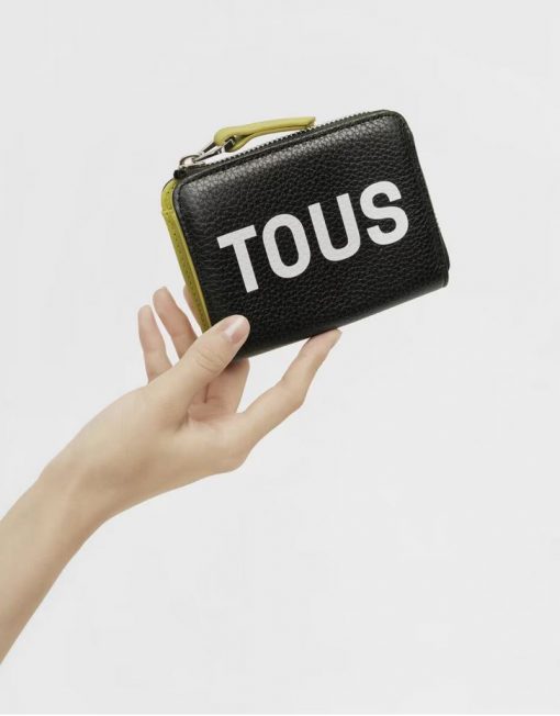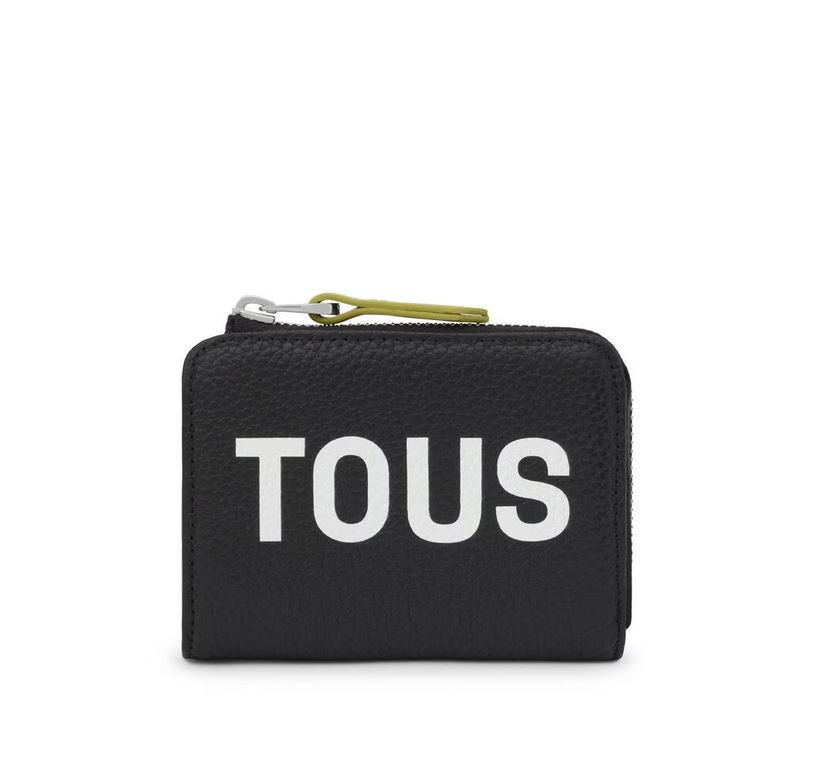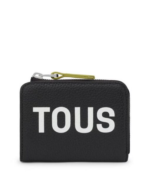 Cartera Logo TOUS Lynn de piel vacuna con certificación LWG en color negro. Cierre con cremallera. En el interior cuenta con 6 ranuras para tarjetas y un bolsillo con cremallera para monedas. Medidas (alto x ancho x fondo): 10 x 13 x 2,5 cm.