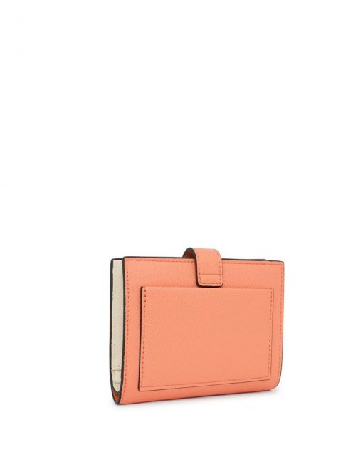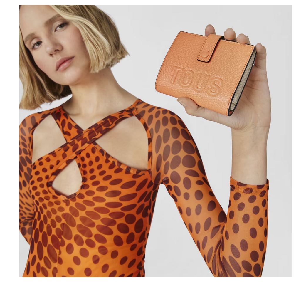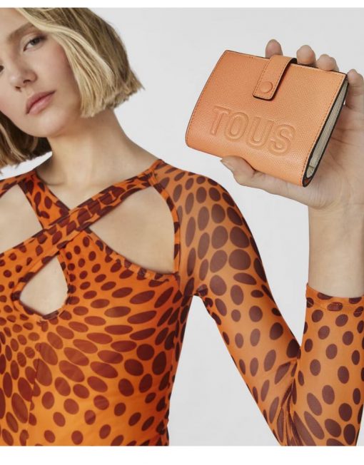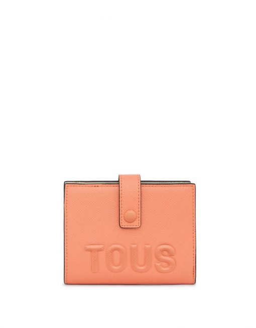 Cartera Pocket TOUS La Rue de piel sintética en color naranja. Cierre con botón a presión y bolsillo trasero abierto. En el interior cuenta con un compartimento abierto para billetes, un bolsillo con botón a presión para monedas y seis ranuras para tarjetas. Medidas (alto x ancho x fondo): 10 x 12 x 3 cm.