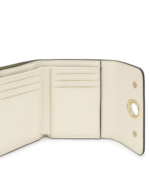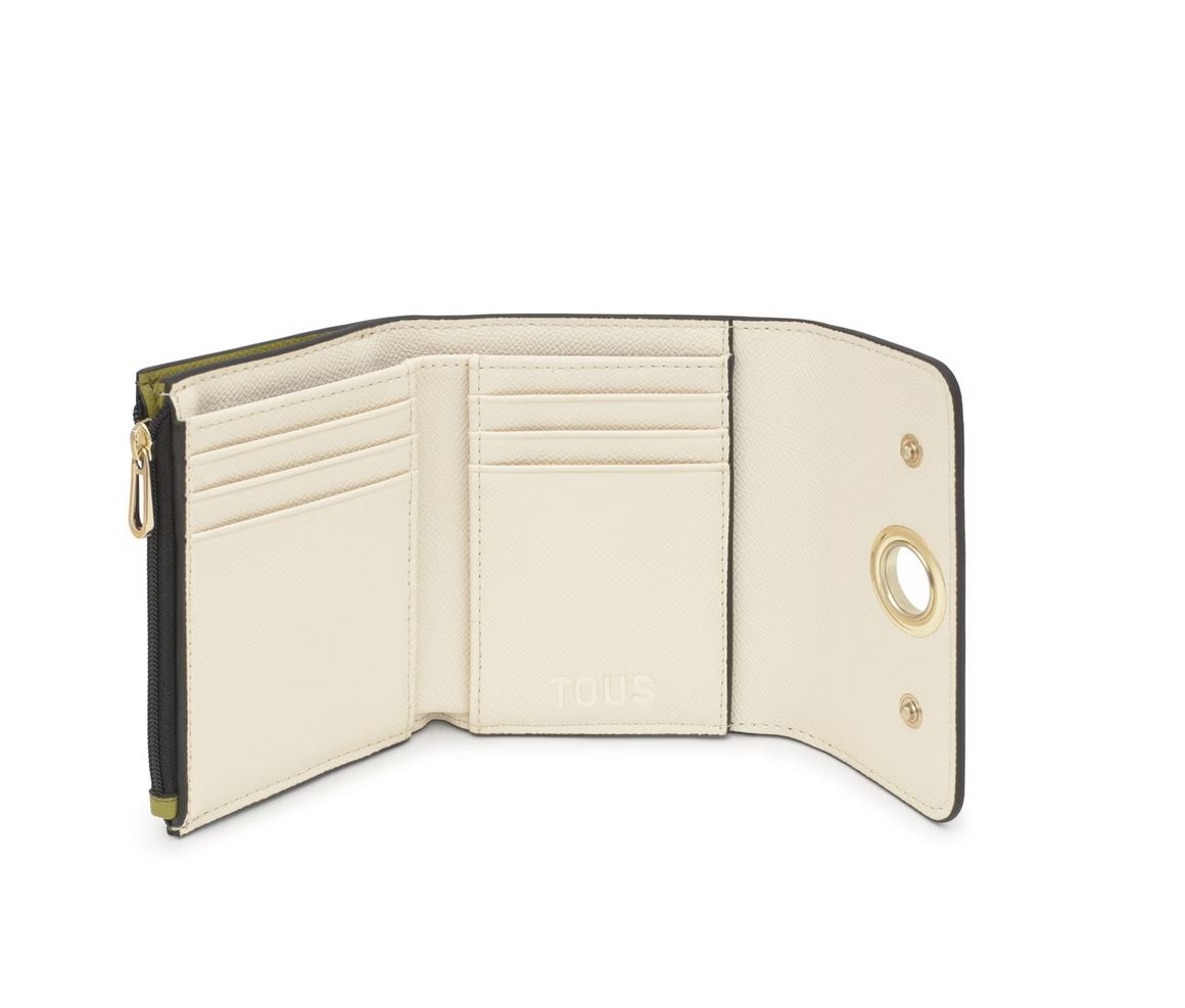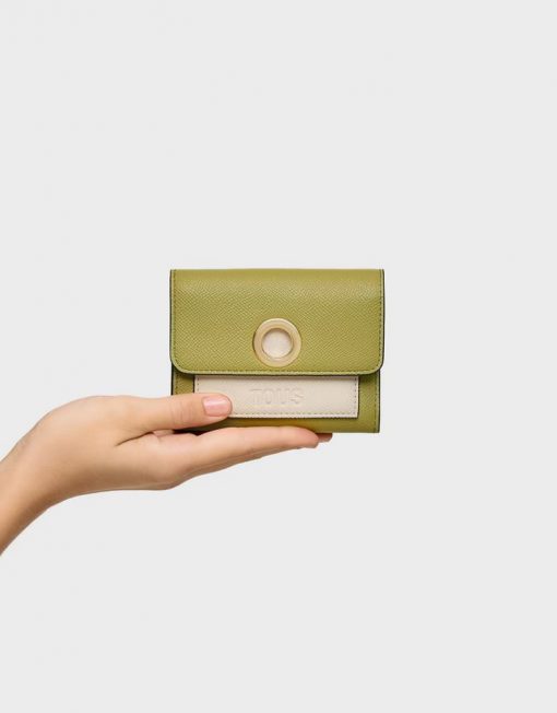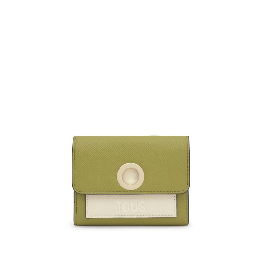 Cartera TOUS Poppy de poliuretano en color verde. Cierre de botones a presión. En el interior cuenta con seis ranuras para tarjetas y un compartimento para billetes. Bolsillo para monedas con cierre de cremallera. Medidas (alto x ancho x fondo): 10 x 12 x 1,7 cm.