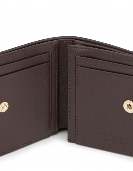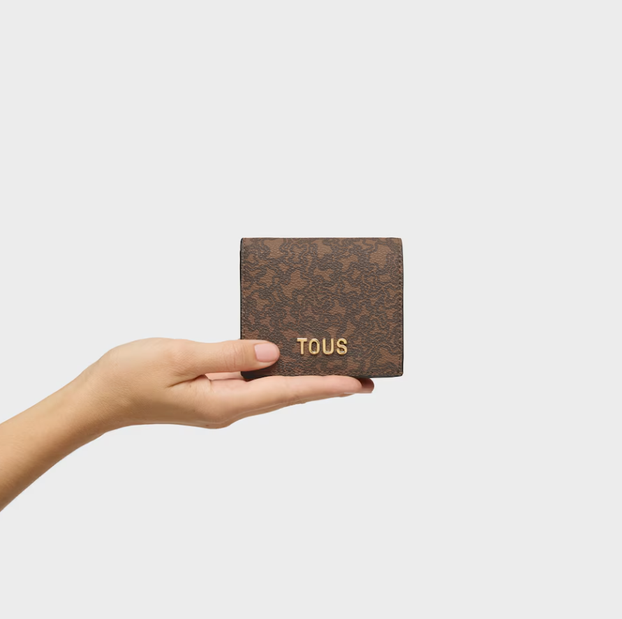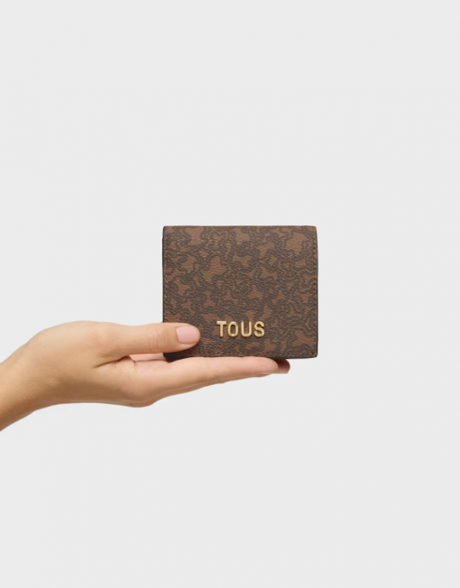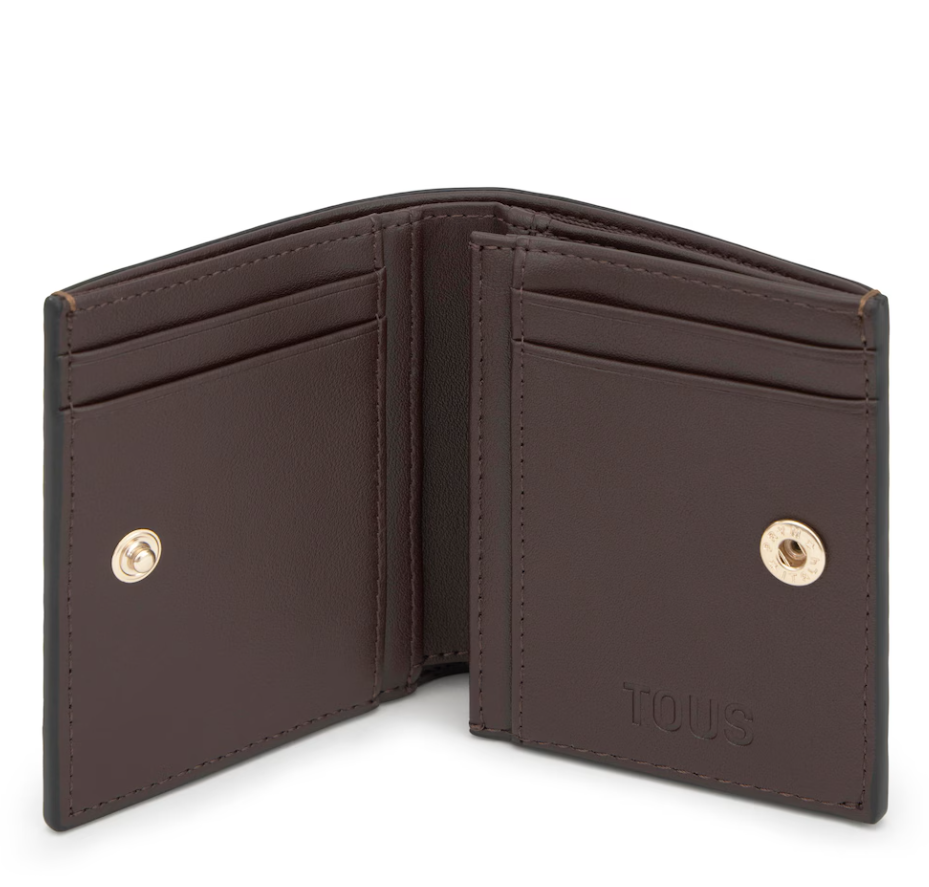 Cartera pequeña Kaos Mini Lines de lona en color marrón. Cierre con botón a presión. Contiene seis ranuras para tarjetas, un compartimento para billetes y un bolsillo con cremallera para monedas. Medidas (alto x ancho x fondo): 8,7 x 10 x 3 cm.