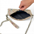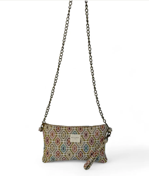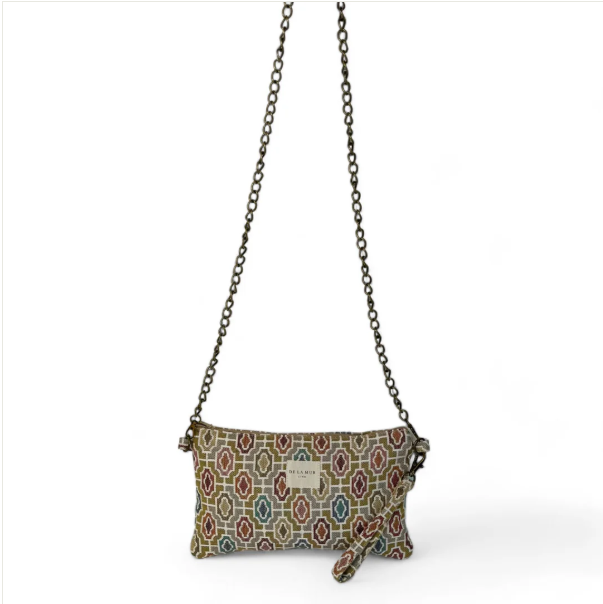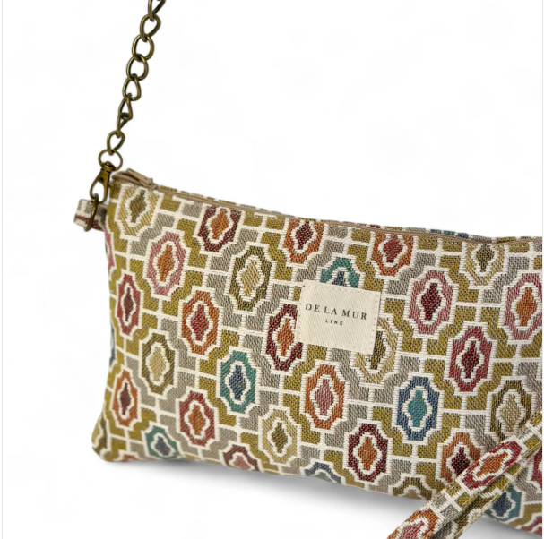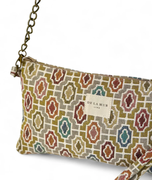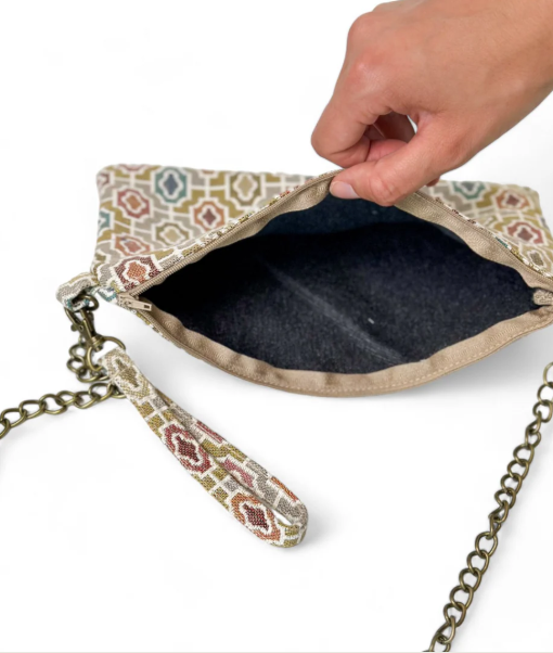 Bolso tipo “Clutch” con asa de cadena de color oro viejo y con asa pequeña en el lateral extraíble para llevar en la muñeca. Con tejido grueso de Jacquard con estampado geométrico en tonos beige, rosa y azul. Con forro interior y cremallera en la parte superior. Para su correcto mantenimiento se aconseja lavarlo en frío y no utilizar secadora.