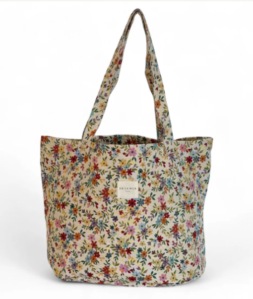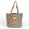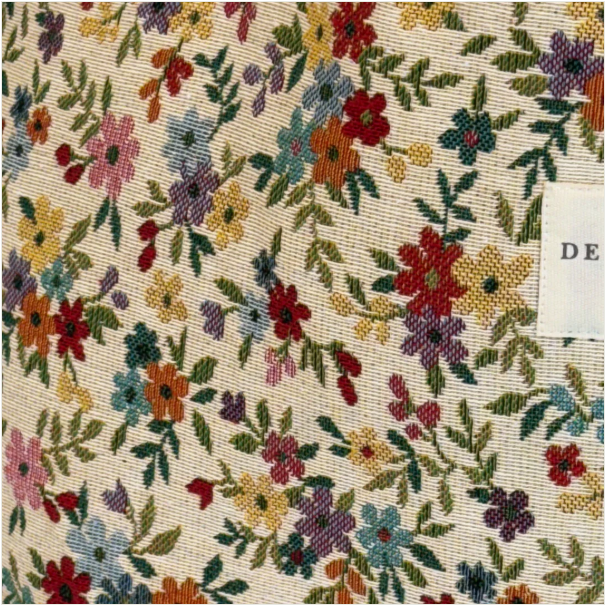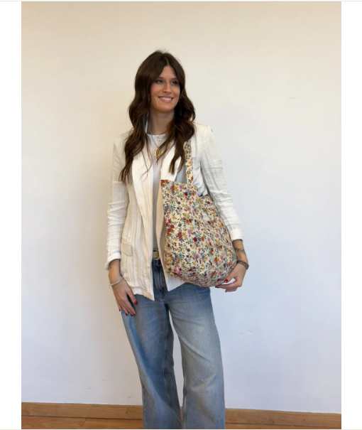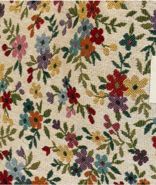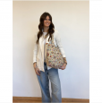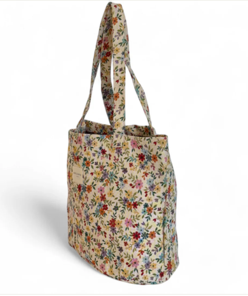 Bolsa shopper grande con asas para llevar al hombro. Con tejido grueso de jacquard con estampado floral sobre fondo beige. Para su correcto mantenimiento se aconseja lavarlo en frío a mano y no utilizar la secadora.