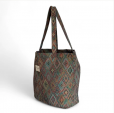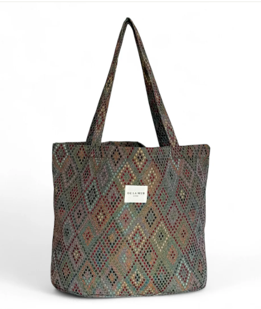 Bolsa shopper grande con asas para llevar al hombro. Con tejido grueso de jacquard con estampado geométrico de color gris. Para su correcto mantenimiento se aconseja lavarlo en frío a mano y no utilizar la secadora.