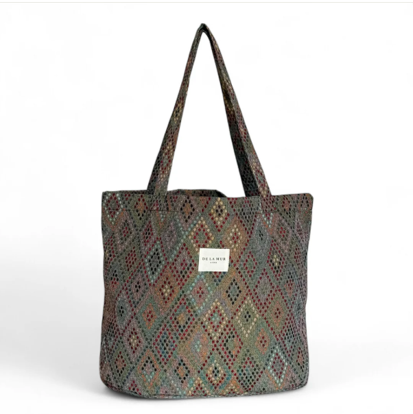 Bolsa shopper grande con asas para llevar al hombro. Con tejido grueso de jacquard con estampado geométrico de color gris. Para su correcto mantenimiento se aconseja lavarlo en frío a mano y no utilizar la secadora.