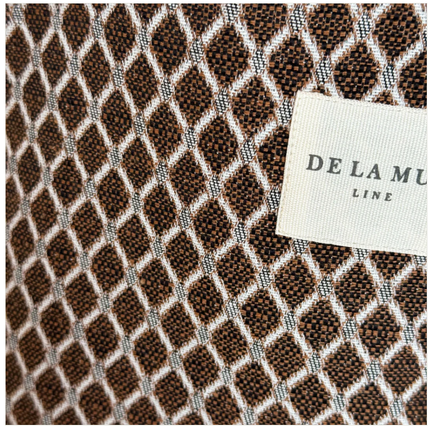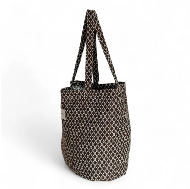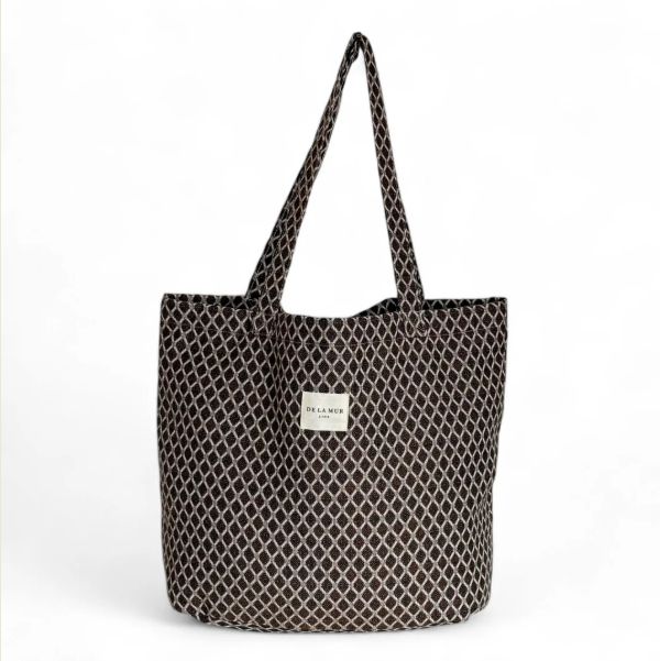 Bolsa shopper grande con asas para llevar al hombro. Con tejido grueso de jacquard con estampado geométrico en tono marrón. Para su correcto mantenimiento se aconseja lavarlo en frío a mano y no utilizar la secadora.