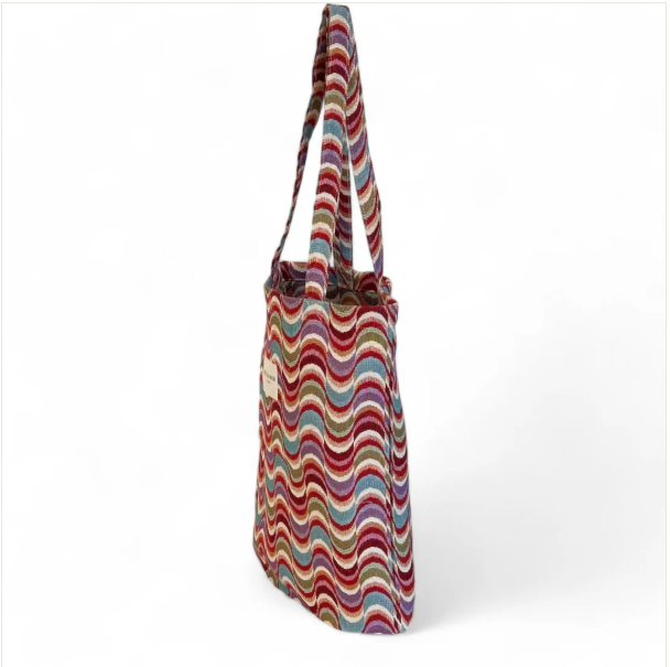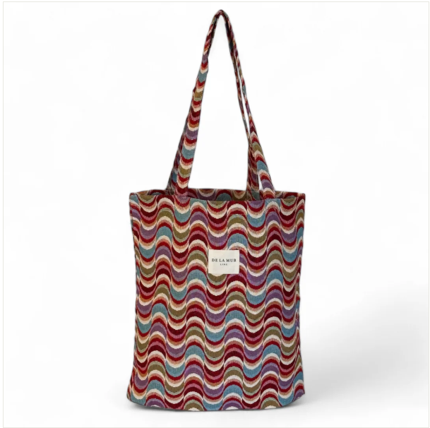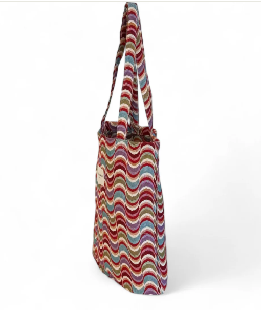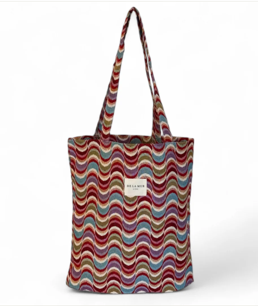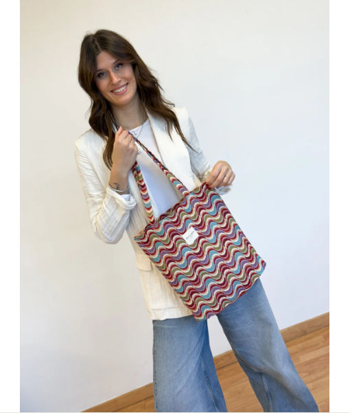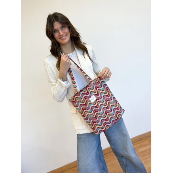Bolsa "tote bag" con asas para llevar al hombro. Con tejido grueso de jacquard con estampado geométrico multicolor. Para su correcto mantenimiento se aconseja lavarlo en frío y no utilizar secadora.