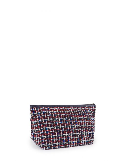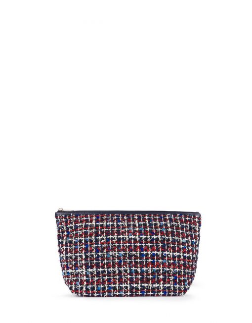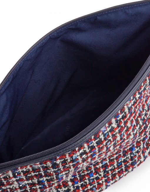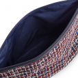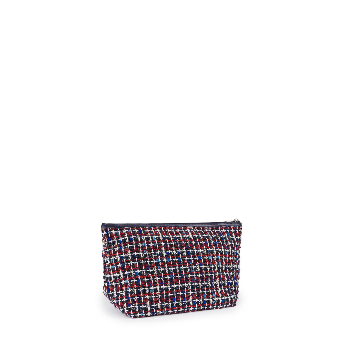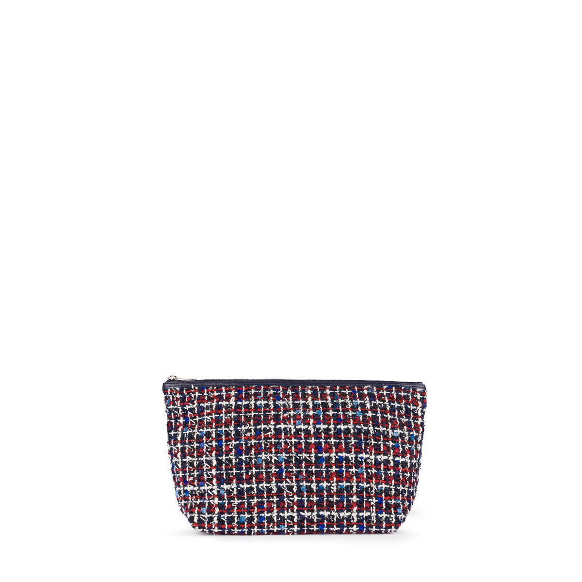 Bolsa pequeña TOUS colección Kaos Shock de tejido Tweed multi-marino. Cierre con cremallera. Apliques personalizados en tono dorado pálido. Botones a presión en los laterales para incorporar dentro de un capazo pequeño Kaos Shock. Medidas: 20x26x14 cm.