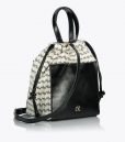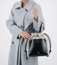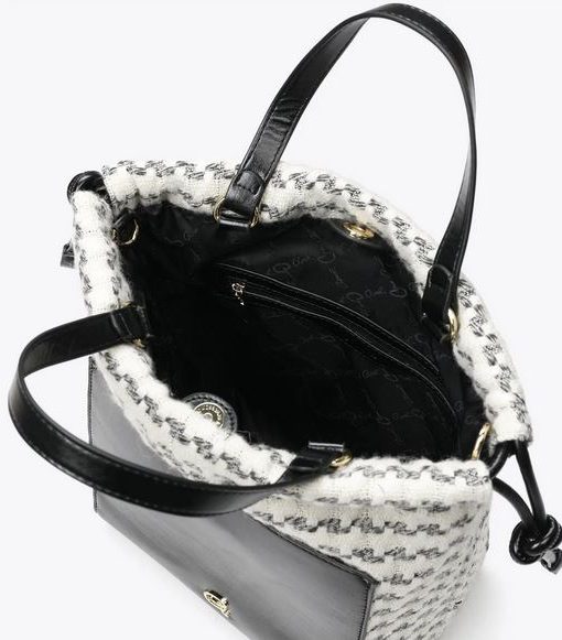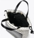Bolso tipo cartera para mujer confeccionado en polipiel y tela de alta calidad, con forro interior. Cierre con botón magnético y cordón. Provisto de una correa desmontable/ajustable y se puede llevar cruzado. Cuenta con un compartimento interno con cremallera y otro externo con botón.