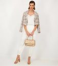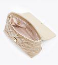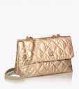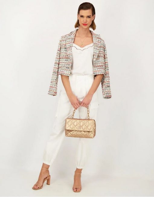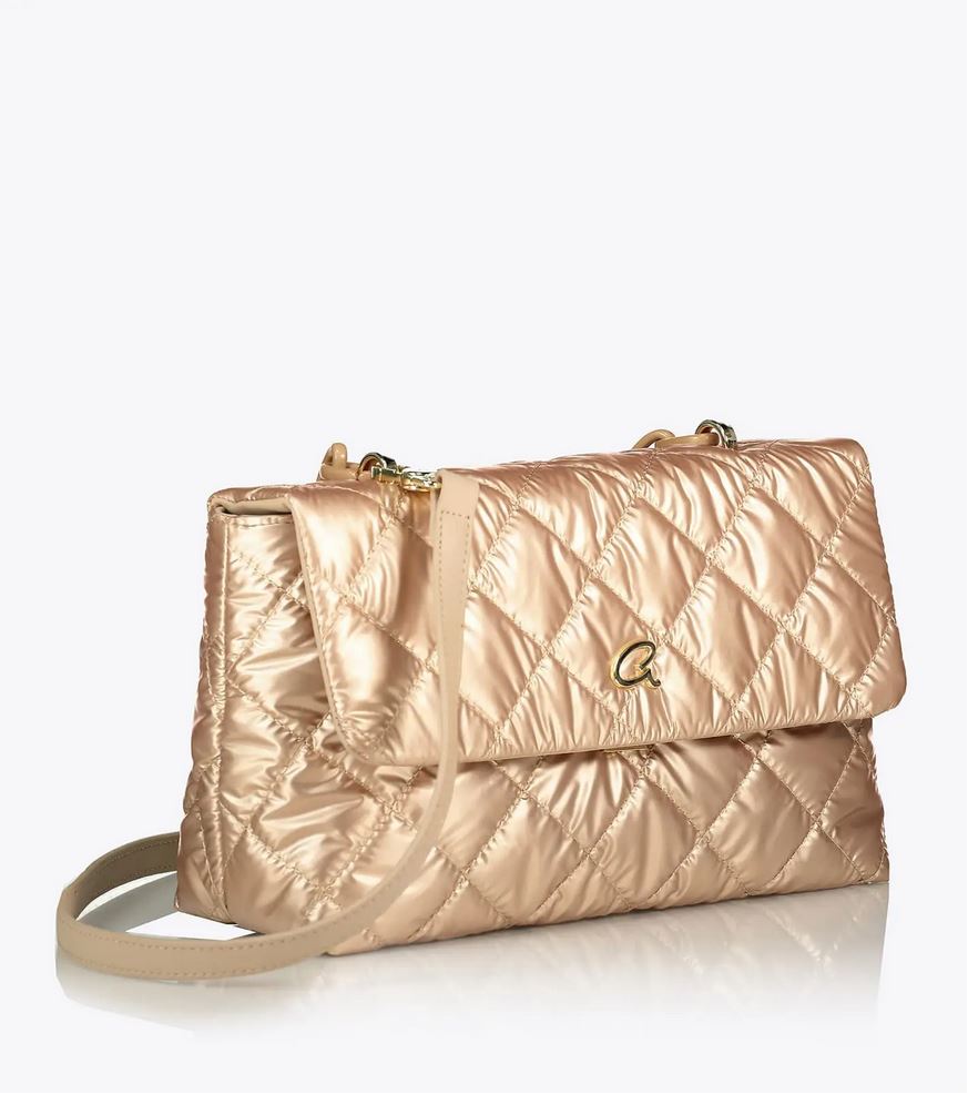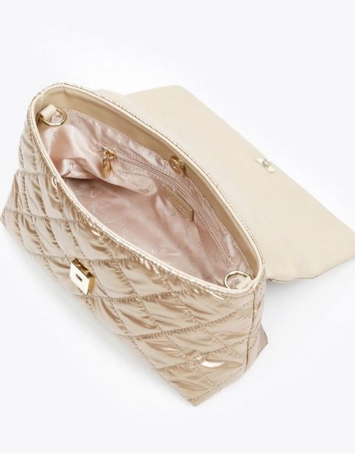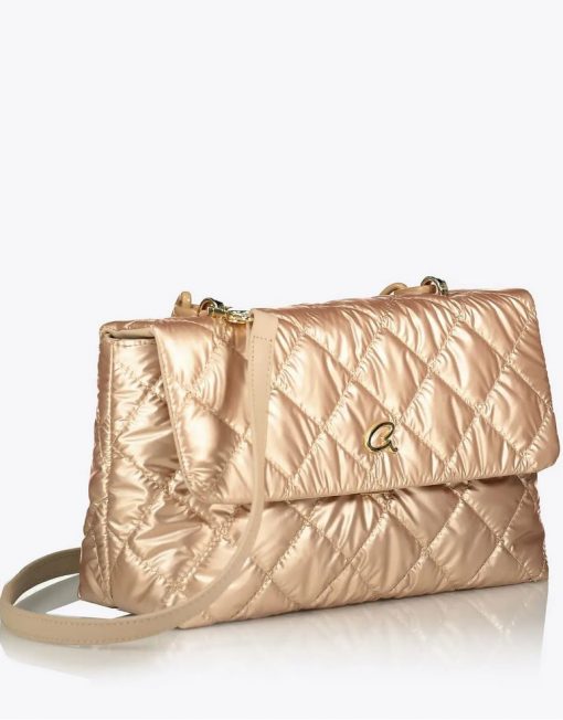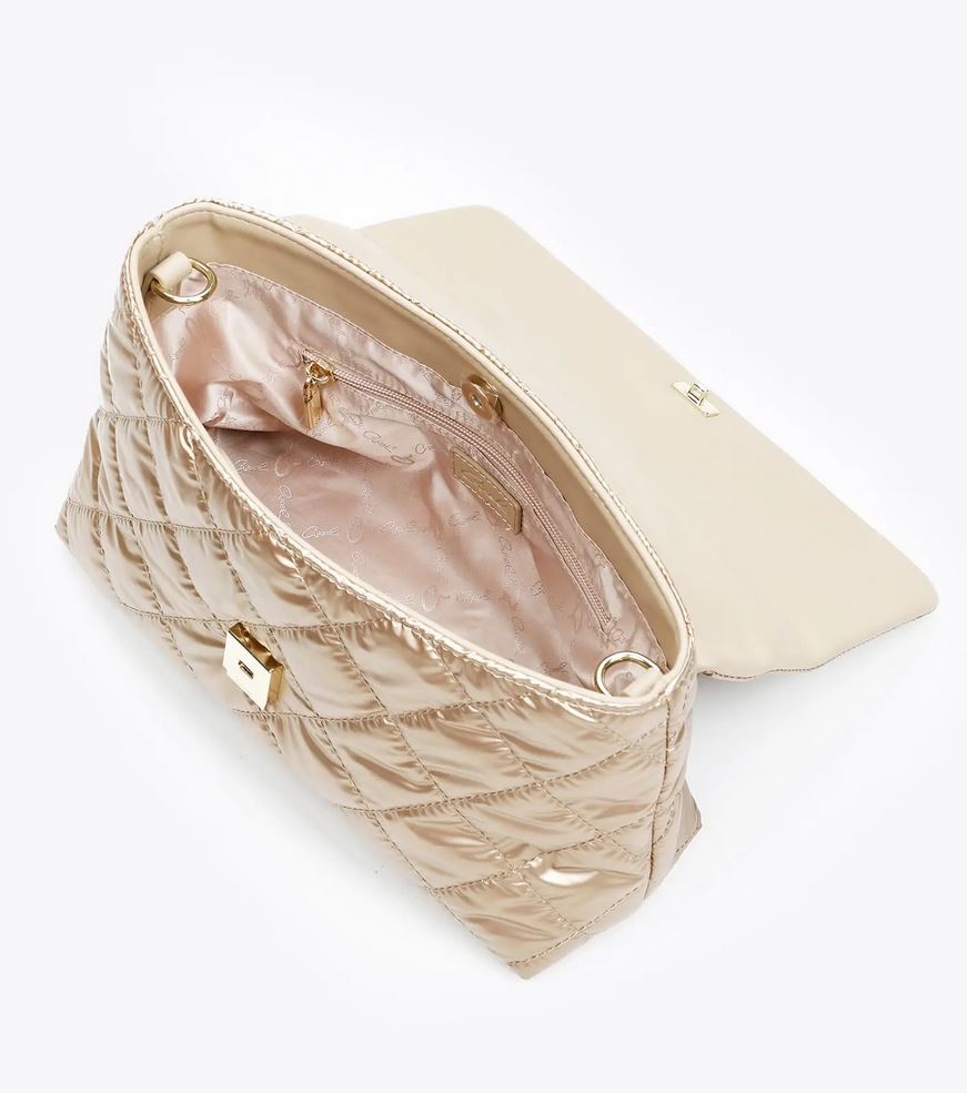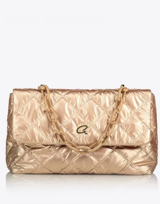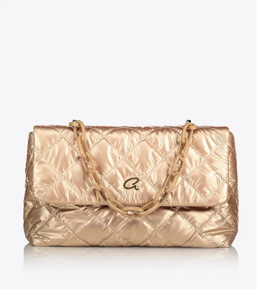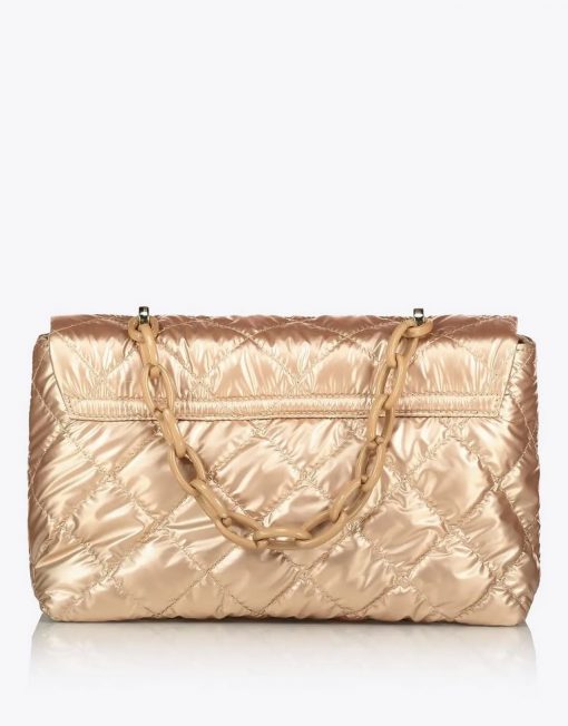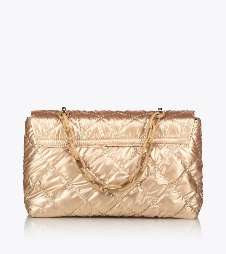 Bolso de mano de nailon acolchado con asa superior de cadena de plástico. Se cierra con un cierre magnético oculto en la tapa y presenta una correa para el hombro desmontable. El interior está forrado y tiene un bolsillo con cremallera.