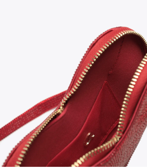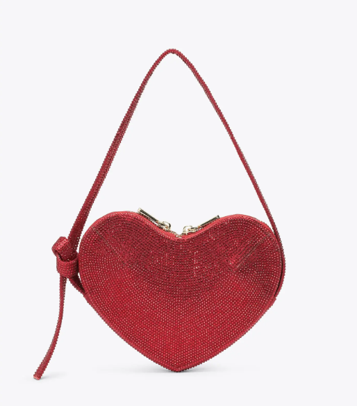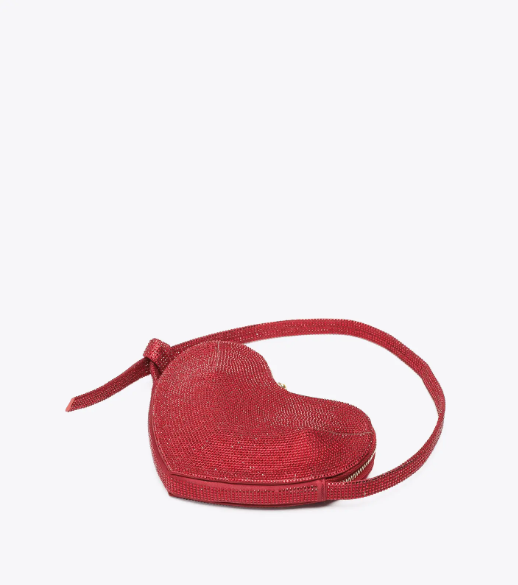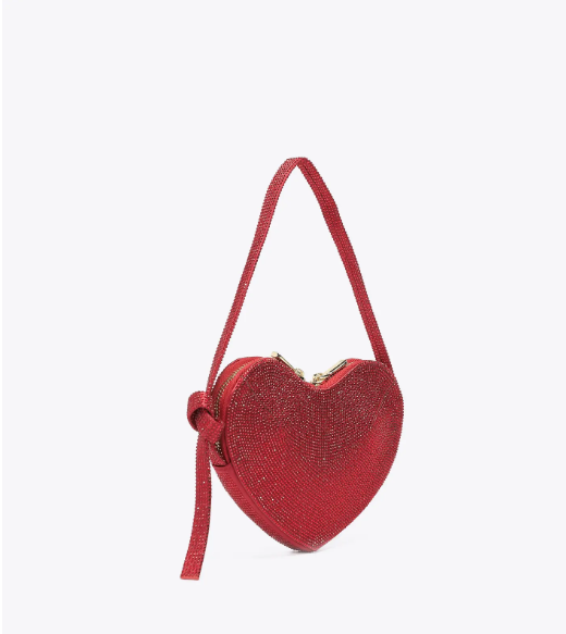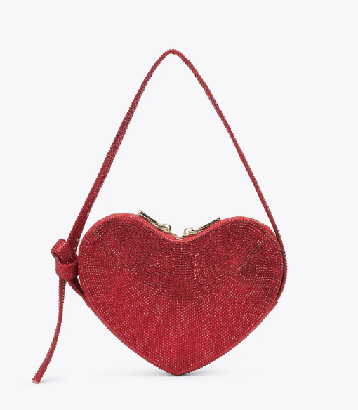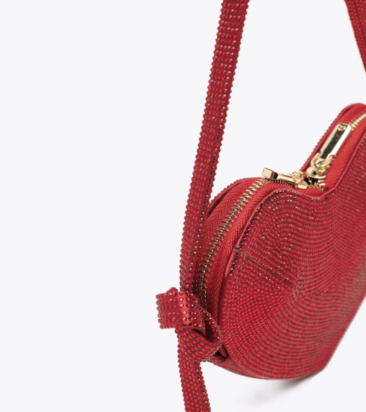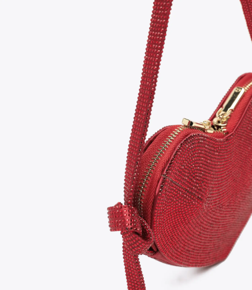 Deslumbrante bolso de noche en forma de corazón, totalmente decorado con pedrería brillante. Cuenta con una correa de mano de pedrería y un cierre de doble cremallera para asegurar sus pertenencias. En el interior, el forro de tela y el compartimento abierto ofrecen practicidad y organización. Eleva tus looks de noche con este bolso imprescindible que combina romance y glamour.