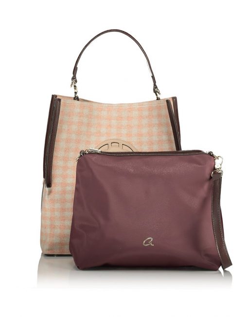 Bolso bandolera de mujer confeccionado en tejido de cuadros y piel artificial. Cuenta con detalle de monograma cortado con láser y una bolsa adicional con correa larga para el hombro en color de contraste para facilitar su transporte. Conjunto de dos piezas de bandolera y bandolera.