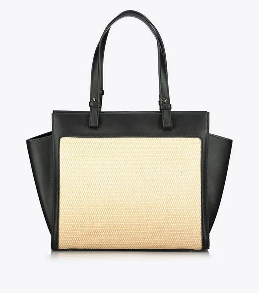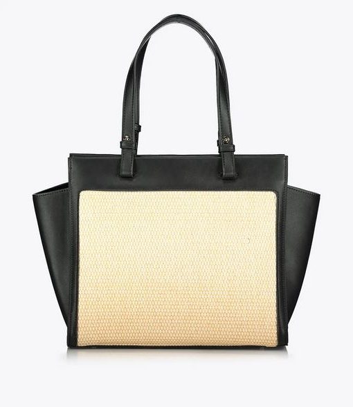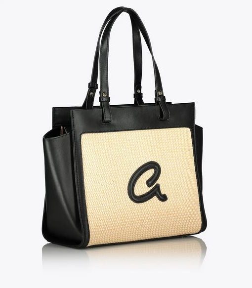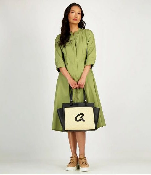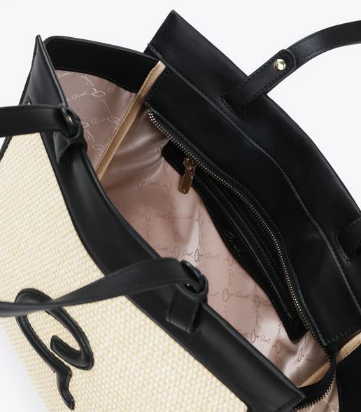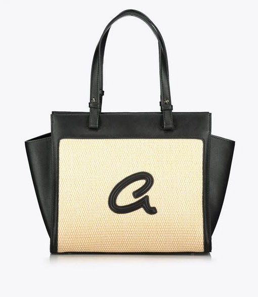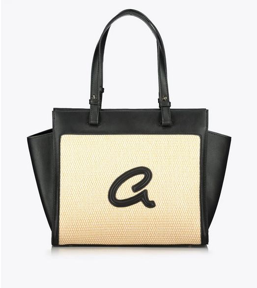 Bolso bandolera de mujer en combinación de piel sintética de alta calidad con paja. Tiene forro interior y funda interior con cremallera. Doble asa, cierre de cremallera y monograma ‘a’ grabado en relieve.