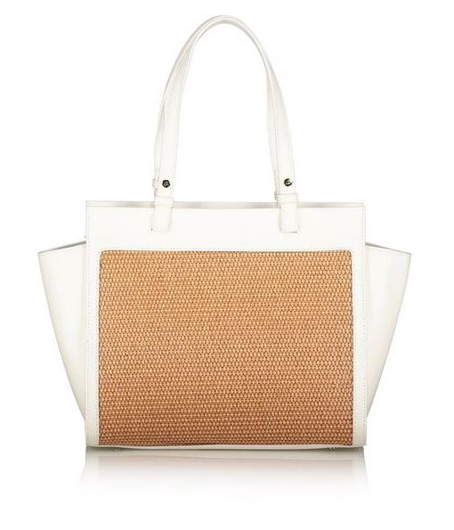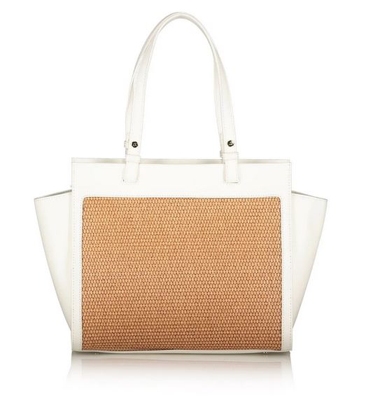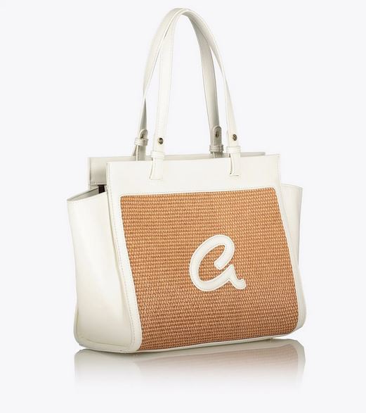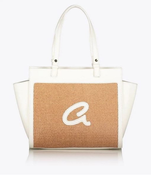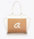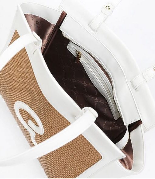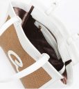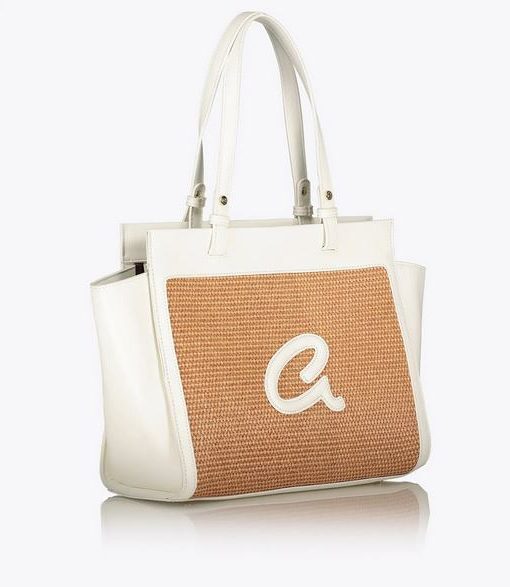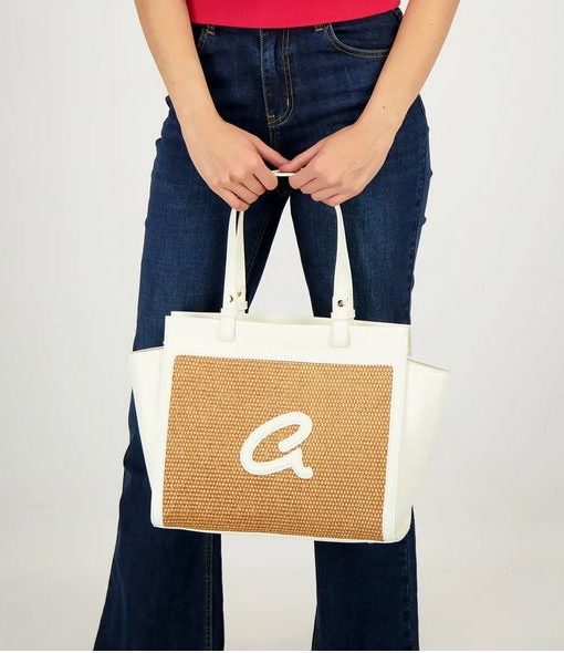 Bolso bandolera de mujer en combinación de piel sintética de alta calidad con paja. Tiene forro interior y funda interior con cremallera. Doble asa, cierre de cremallera y monograma ‘a’ grabado en relieve.
