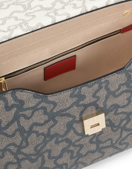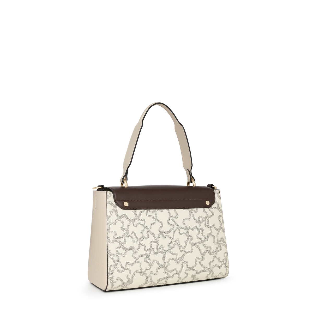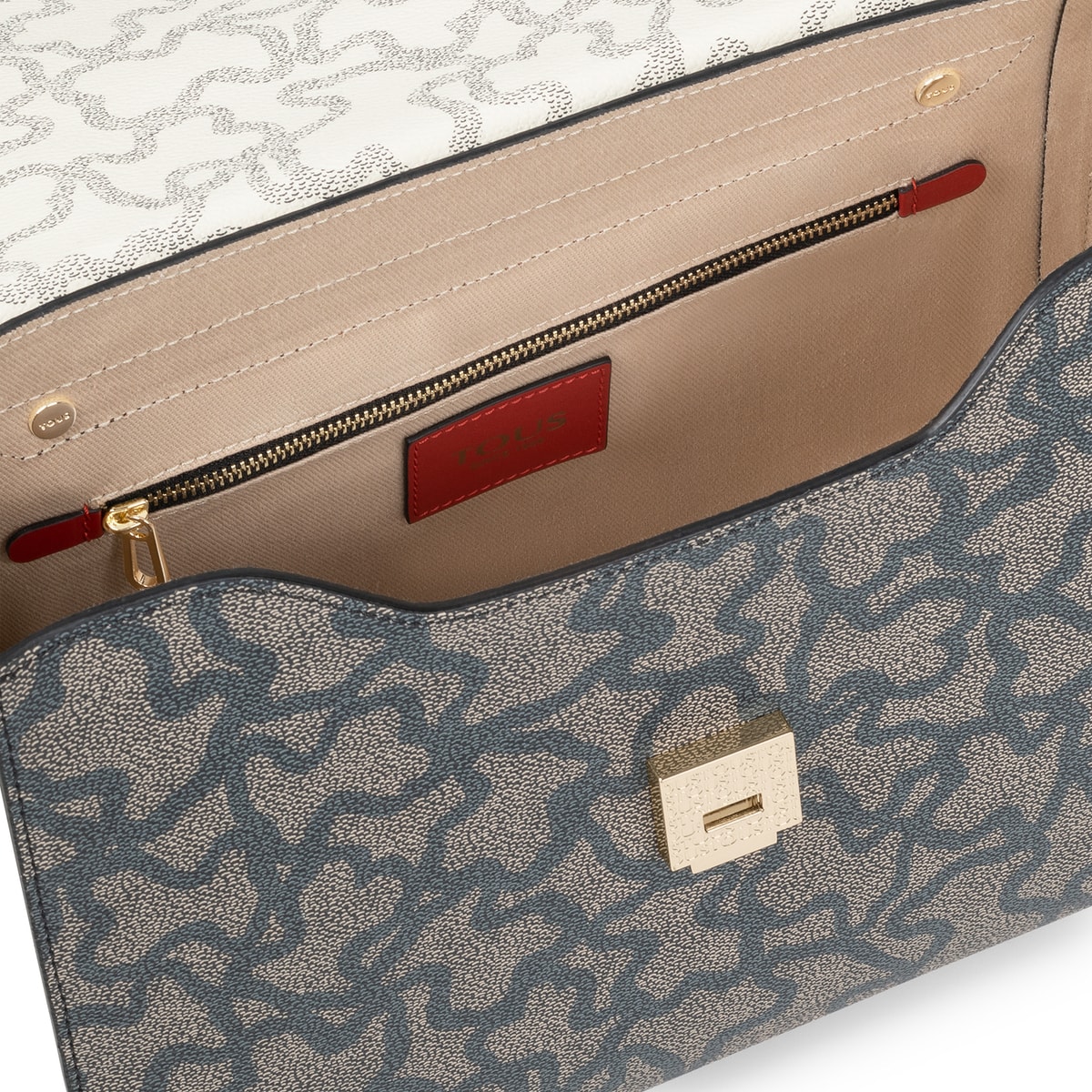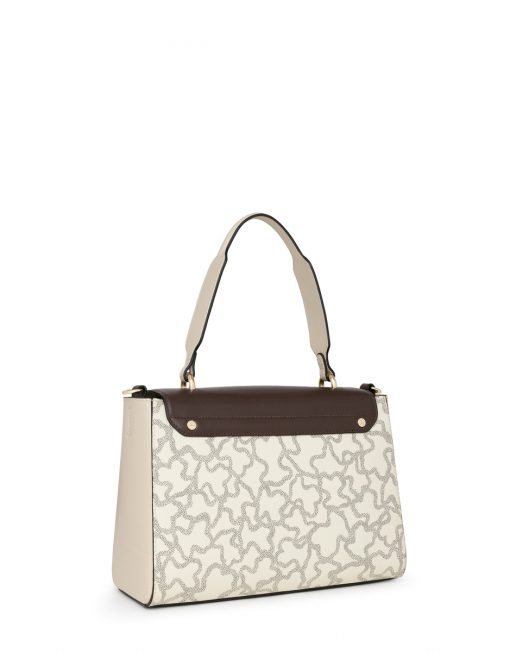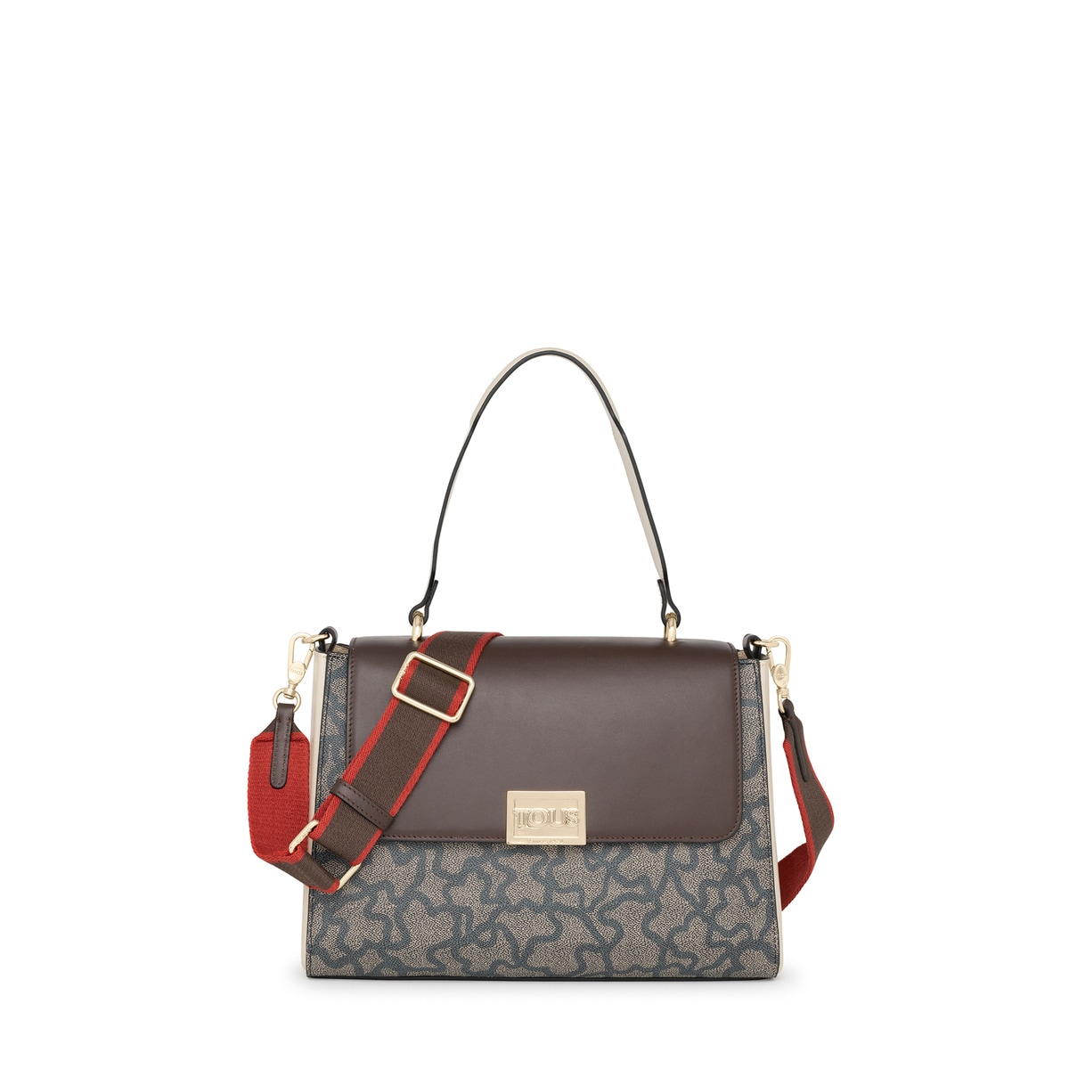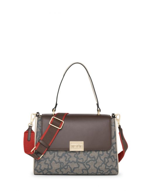 Bolso city TOUS Kaos Legacy de lona hidrófuga con estampado Kaos en color negro y beige. También incorpora detalles en piel vacuna de color marrón, beige y rojo. Viene con solapa y el cierre es a presión. Cuenta con un bolsillo interior con cierre de cremallera. Además, tiene una doble funcionalidad ya que puede usarse como bolso de hombro o como bandolera gracias al asa de webbing ajustable y extraíble que incorpora. Medidas (alto x ancho x fondo): 22 x 30 x 10 cm.