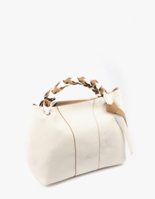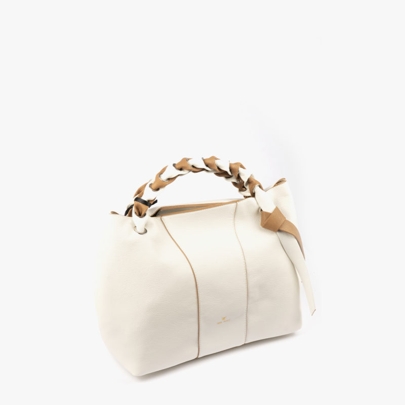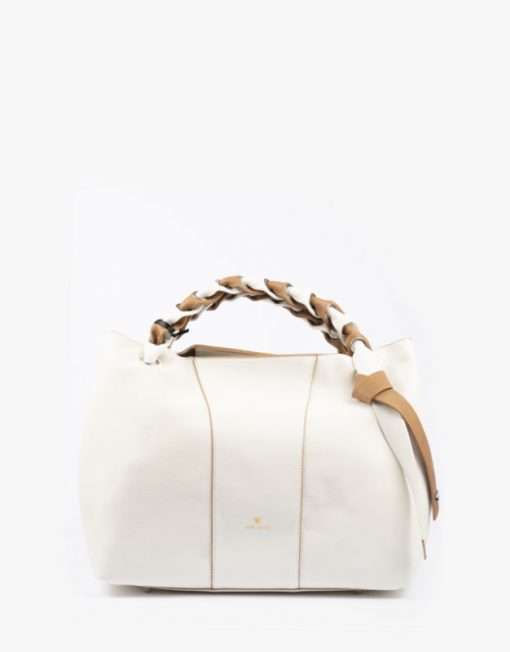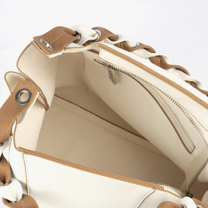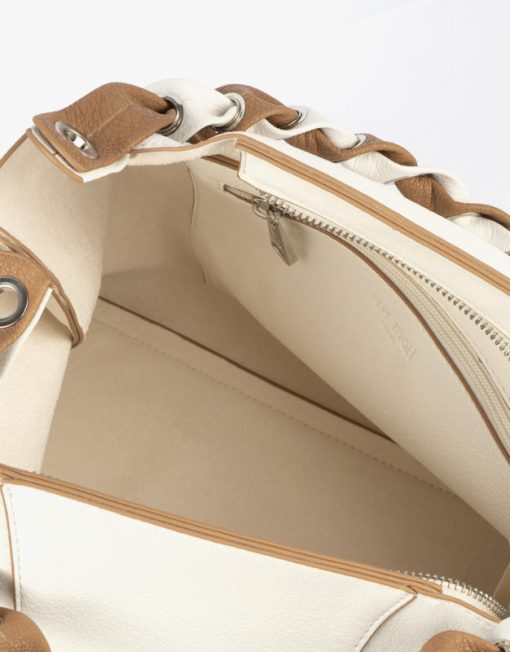 Bolso de mano blanco de Pepe Moll. Es un bolso grande con una gran capacidad en su interior. Un diseño con carácter mediterráneo que destaca gracias al contraste de sus colores estivales y el trenzado del asa principal.