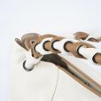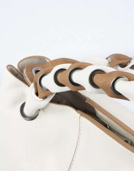 Además, en la parte delantera se pueden ver dos líneas pequeñas en color marrón. Como broche final una tira enlazada al asa en tono marrón.