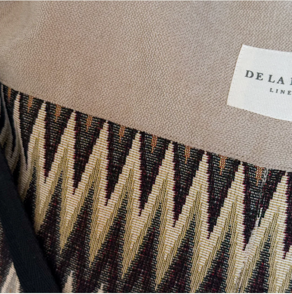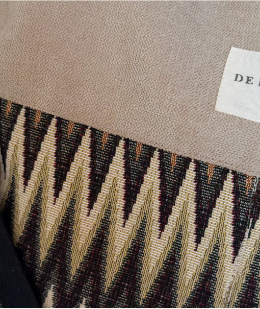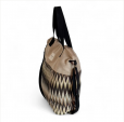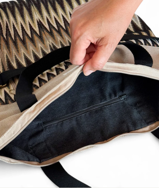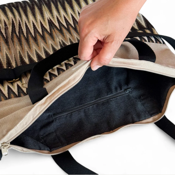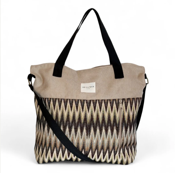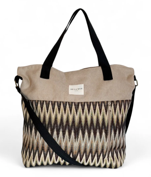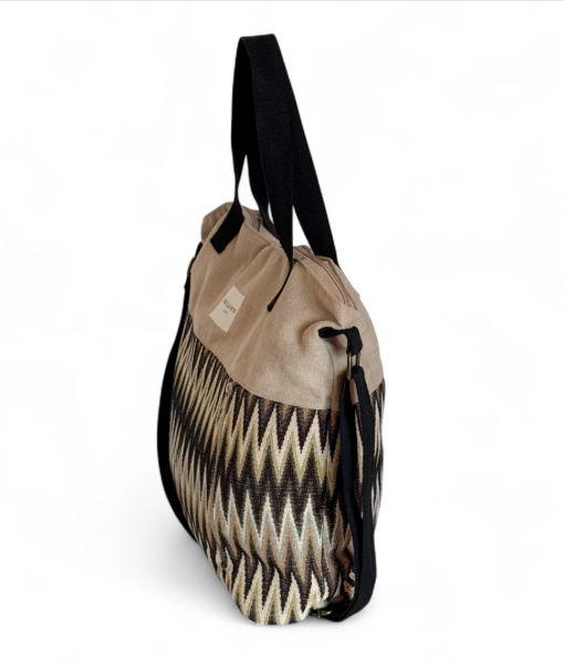 Bolso grande con asa larga ajustable y dos asas medianas en la parte superior de cinta de espiga de algodón de color negro. Combinado con dos tejidos diferentes, un tejido grueso tapicero de color beige en la parte superior y un tejido grueso de jacquard con estampado geométrico en tonos marrones y beige en la parte inferior. Cierre superior con cremallera. Forrado de tejido grueso de color gris en la parte interior. Bolsillo interior y exterior con cremallera. Opción de llevarlo al hombro o como bandolera. Para su correcto mantenimiento se aconseja lavarlo en frío a mano y no utilizar secadora.