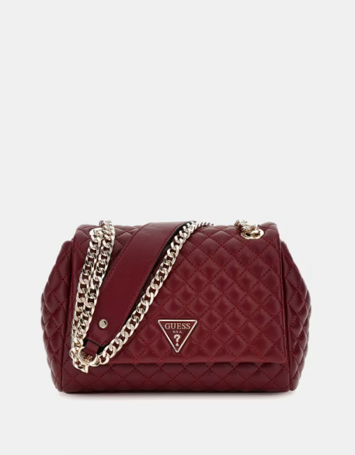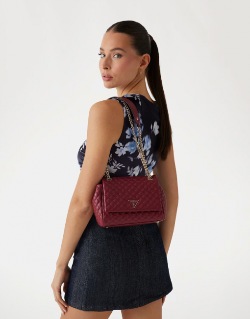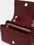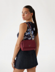Exterior de piel sintética pespunteada. Cierre con solapa y botón. Piezas metálicas color dorado pálido.