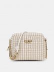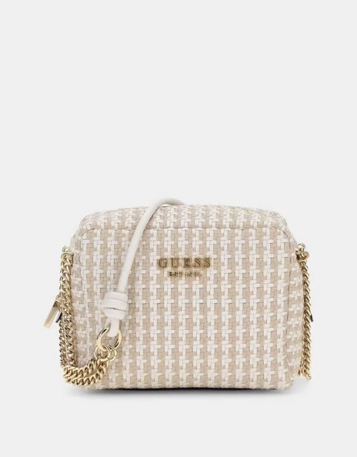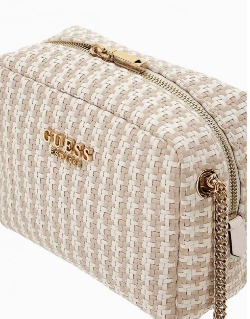 Exterior de piel sintética trenzada. Cierre con cremallera. Piezas metálicas color dorado pálido.