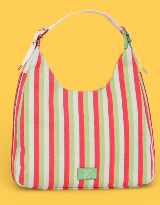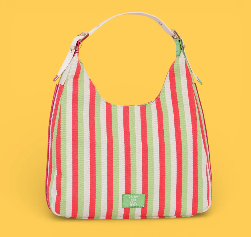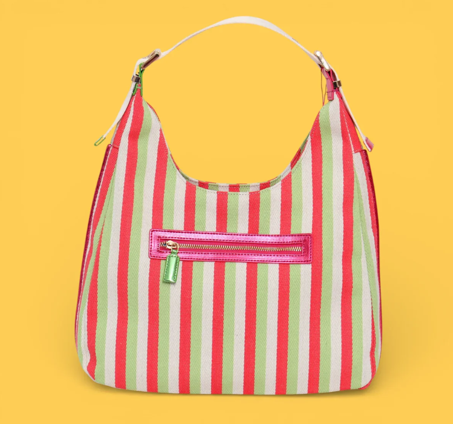 Bolso hobo confeccionado en lona resistente con un diseño de líneas en fucsia que le aporta un toque moderno y vibrante. Su forma ergonómica y asas cómodas lo hacen perfecto para el día a día, ofreciendo amplitud para llevar tus pertenencias esenciales. Un accesorio versátil que combina funcionalidad con estilo contemporáneo, ideal para cualquier ocasión casual.