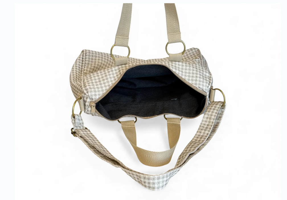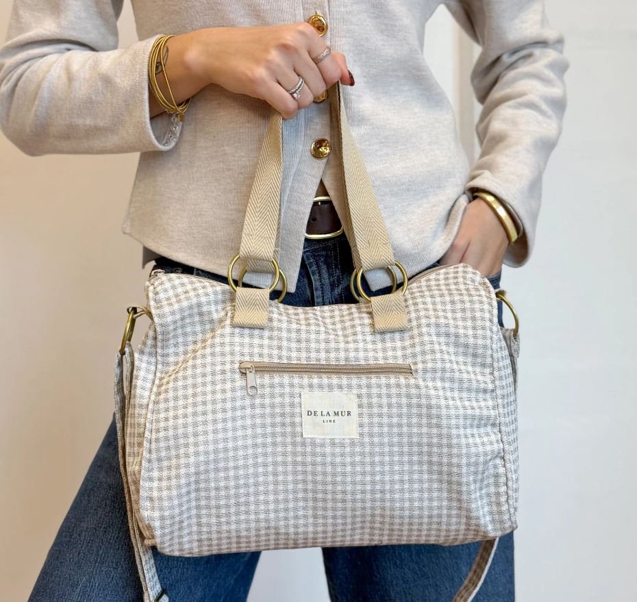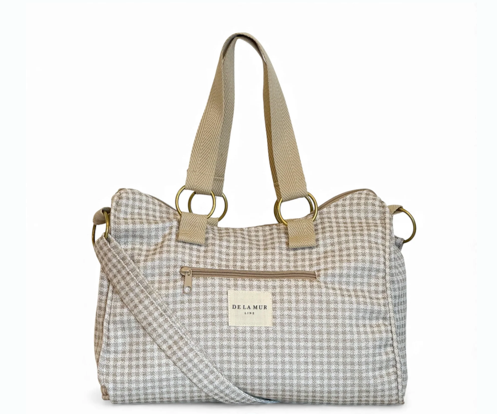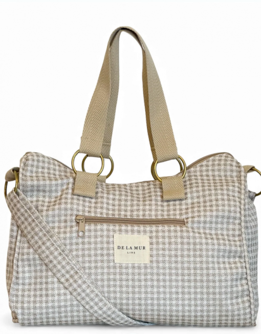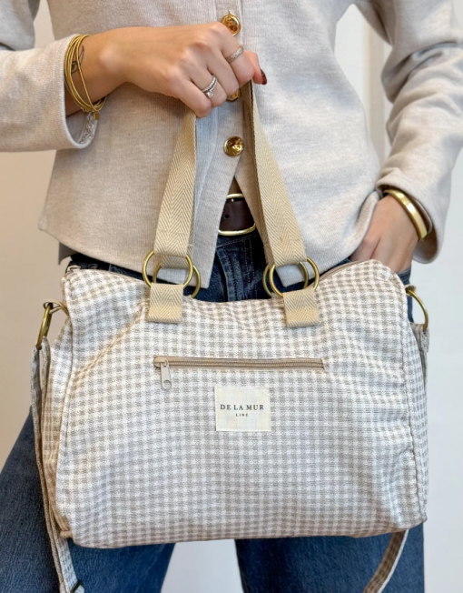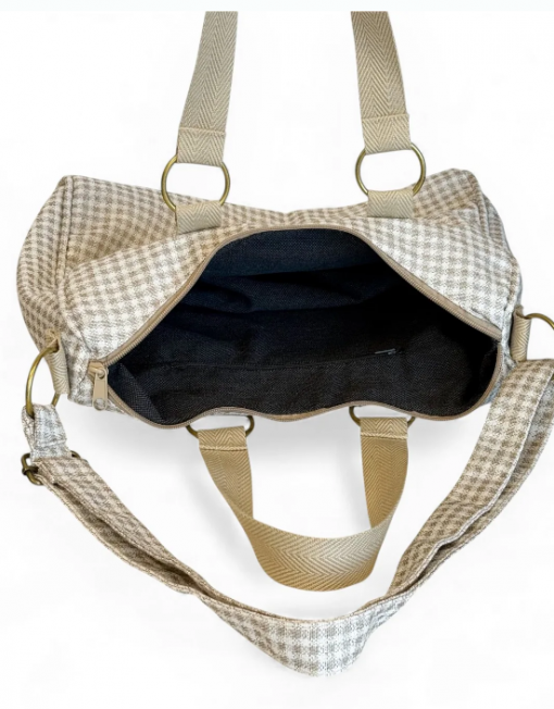 Bolso mediano con asa larga ajustable y dos asas medianas en la parte superior de cinta de espiga de algodón de color crudo con lineas en negro en los laterales. Con un tejido grueso de jacquard 80% algodón y 20% poliéster con estampado a cuadros vichy en tono beige y crudo. Cierre superior con cremallera. Forrado con tejido grueso de color gris oscuro en la parte interior. Bolsillo interior con cremallera. Opción de llevarlo al hombro o como bandolera. Para su correcto mantenimiento se aconseja lavarlo en frío y no utilizar secadora.