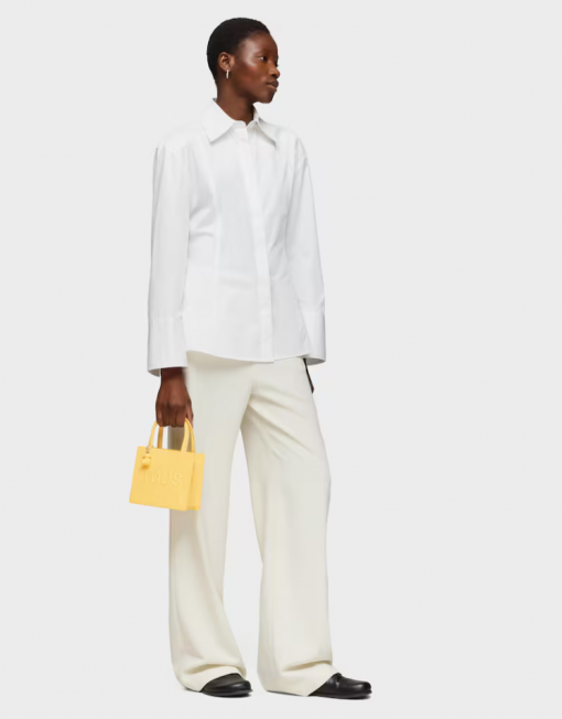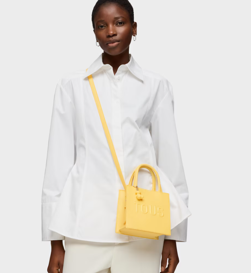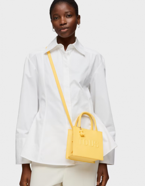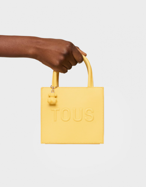 Mini bolso cube TOUS Back to basics de poliuretano en color amarillo. Cierre de botón magnético. Asas fijas de mano y asa bandolera ajustable y desmontable. Incorpora un bonito detalle de oso colgante. Medidas (alto x ancho x fondo): 14 x 16 x 8,5 cm.