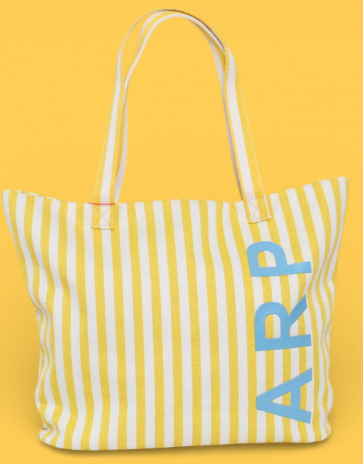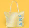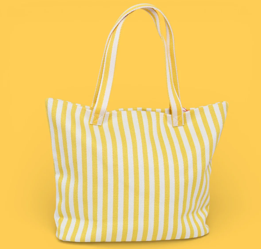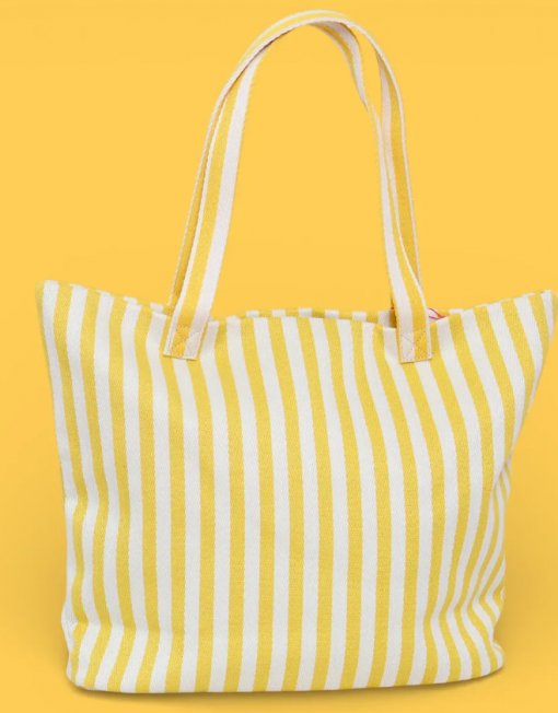 Bolsa tote de playa con diseño de rayas en tonos amarillos, perfecta para llevar tus esenciales de verano. Confeccionada con materiales resistentes y duraderos, ideal para días de sol y arena. Su amplio compartimento principal ofrece espacio suficiente para toallas, protector solar y accesorios de playa. Asas cómodas y reforzadas garantizan un transporte seguro. Un complemento versátil que combina funcionalidad y estilo para tus escapadas costeras.