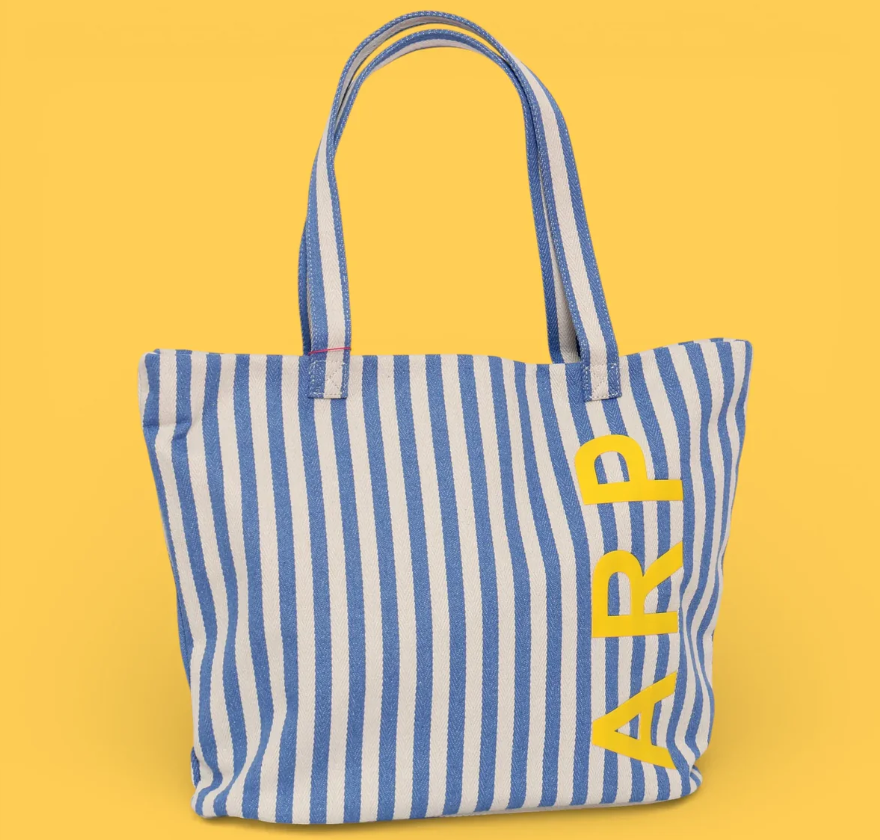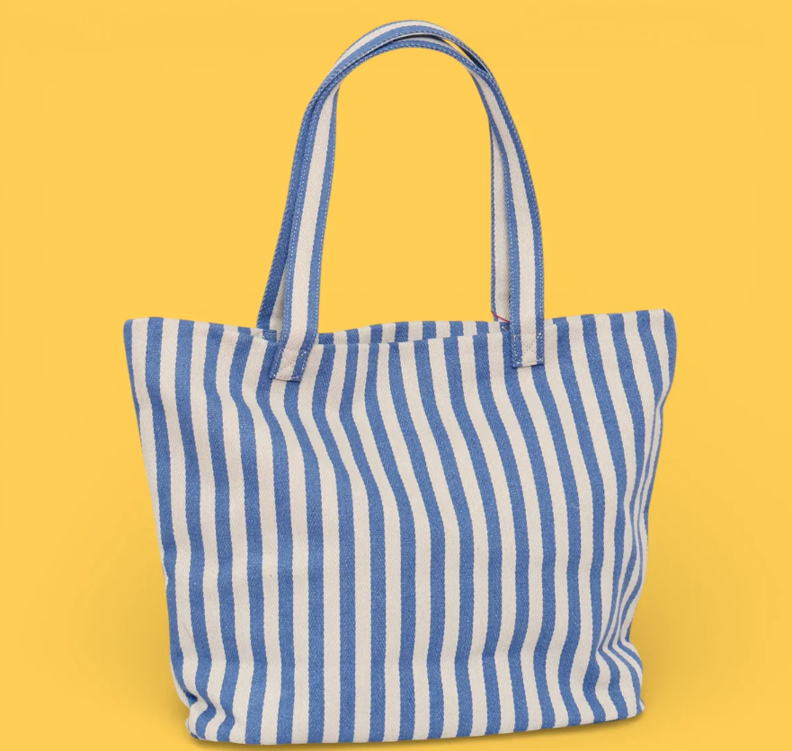 Bolsa tote de playa con diseño de rayas en tonos azules. Perfecta para llevar tus esenciales de verano al mar o la piscina. Confeccionada con materiales resistentes al agua y la arena, ofrece amplio espacio para toallas, protector solar y accesorios. Asas cómodas y duraderas para un transporte fácil. Un complemento imprescindible para disfrutar del sol con estilo.