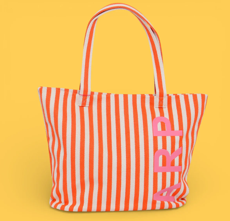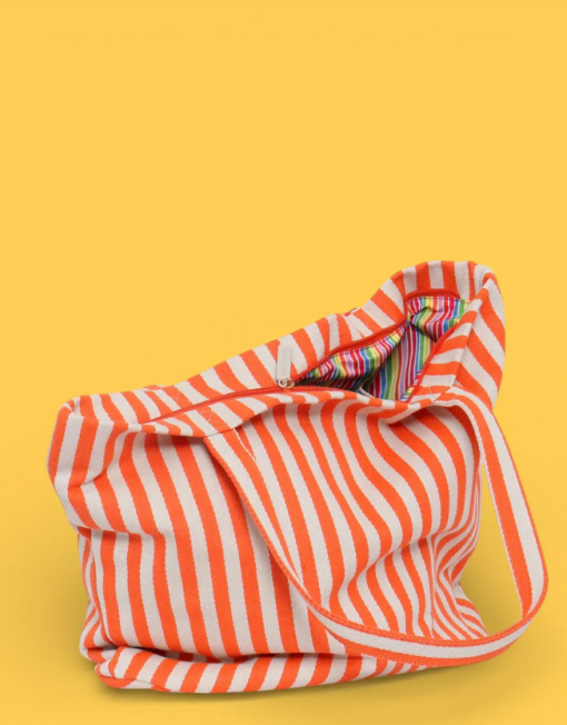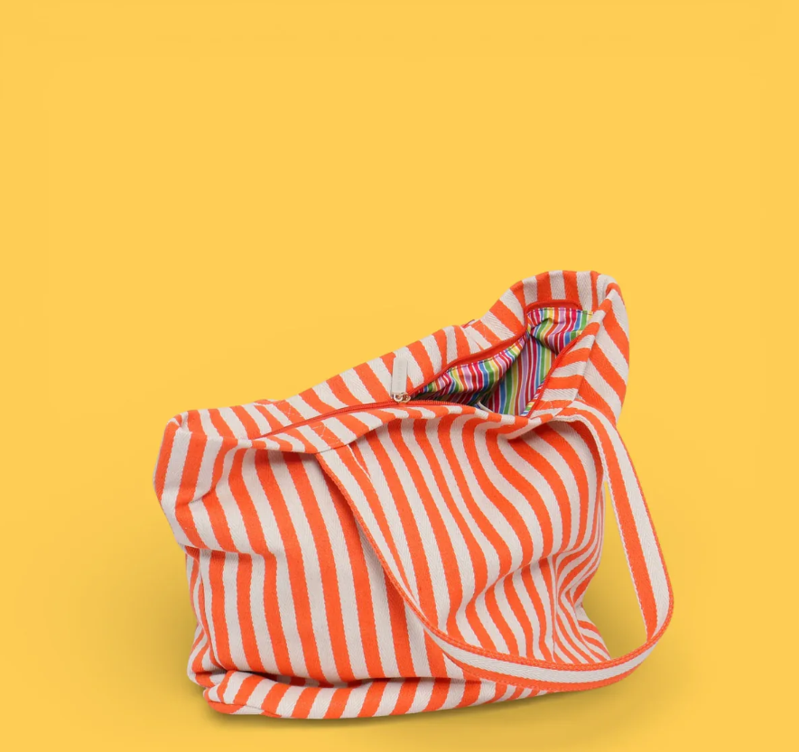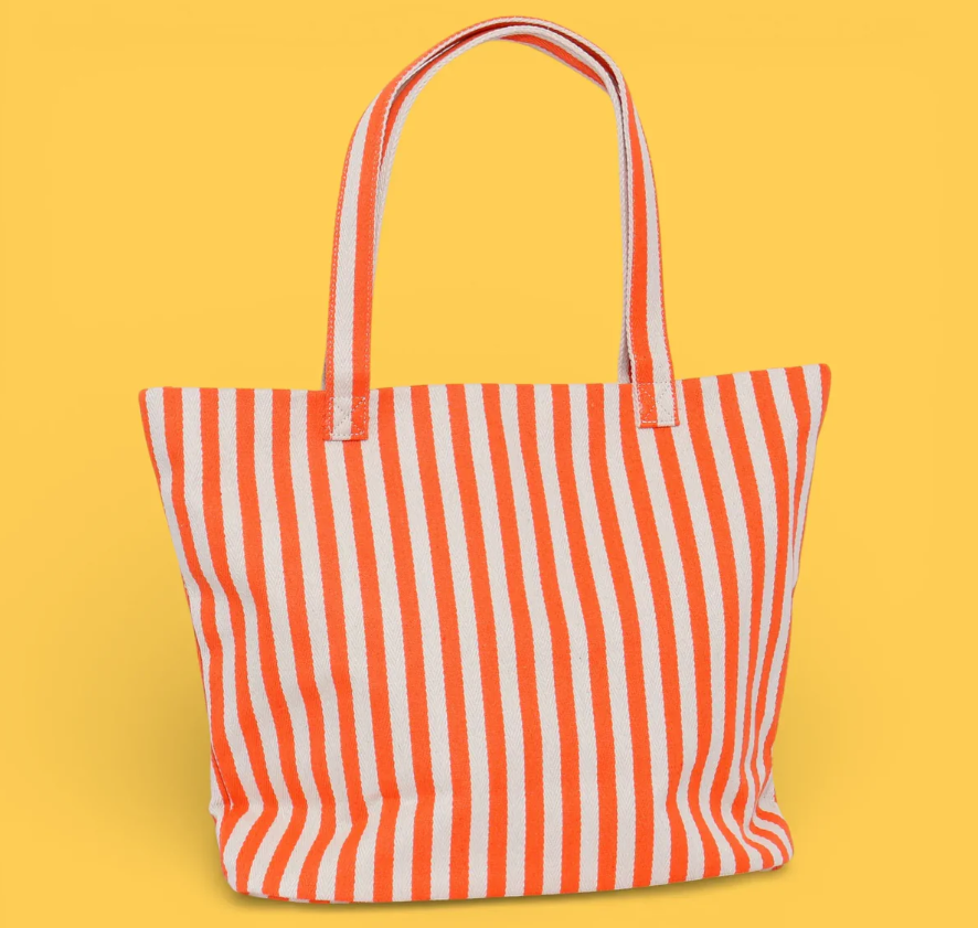 Bolsa tote de playa con diseño de rayas en tonos naranja. Perfecta para llevar tus esenciales de verano a la playa, piscina o cualquier salida al aire libre. Su amplio compartimento principal ofrece espacio suficiente para toallas, protector solar, gafas de sol y más. Confeccionada con materiales resistentes al agua y la arena, garantiza durabilidad y facilidad de limpieza. Asas cómodas para un transporte seguro. Un accesorio versátil y colorido que combina funcionalidad con estilo veraniego.