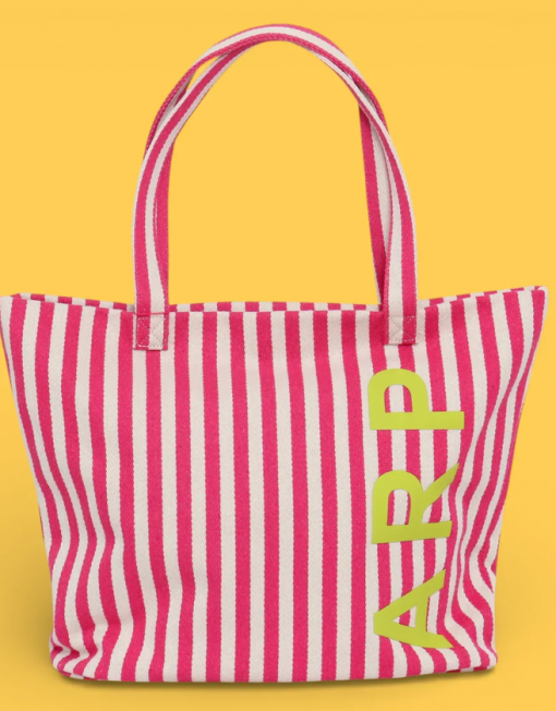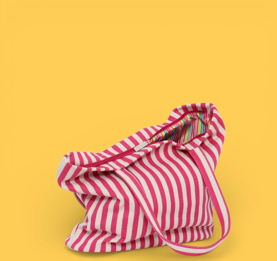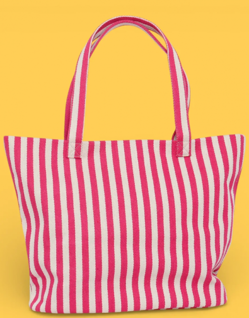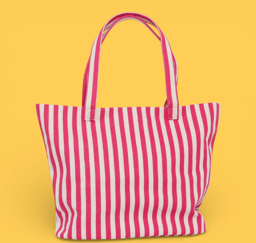Bolsa tote de playa con diseño de rayas en tonos rosa. Perfecta para llevar tus esenciales de verano con estilo. Confeccionada con materiales resistentes y duraderos, ideal para días de sol y arena. Su amplio compartimento principal ofrece espacio suficiente para toallas, protector solar y accesorios de playa. Asas cómodas que facilitan el transporte. Un complemento versátil que combina funcionalidad y elegancia para tus escapadas costeras.
