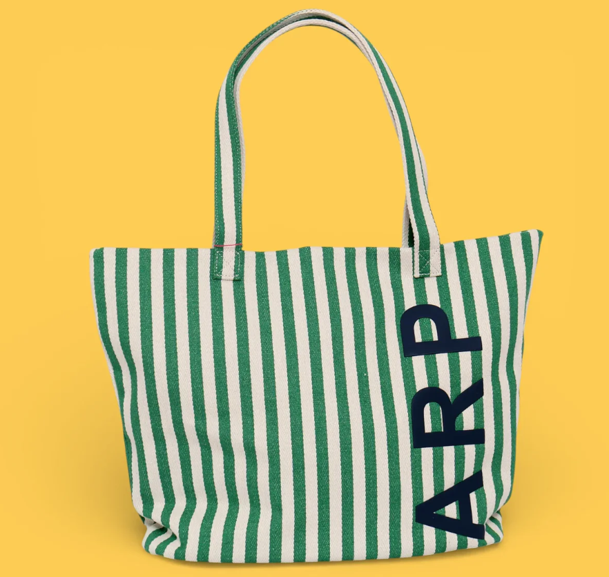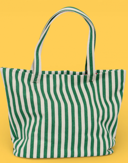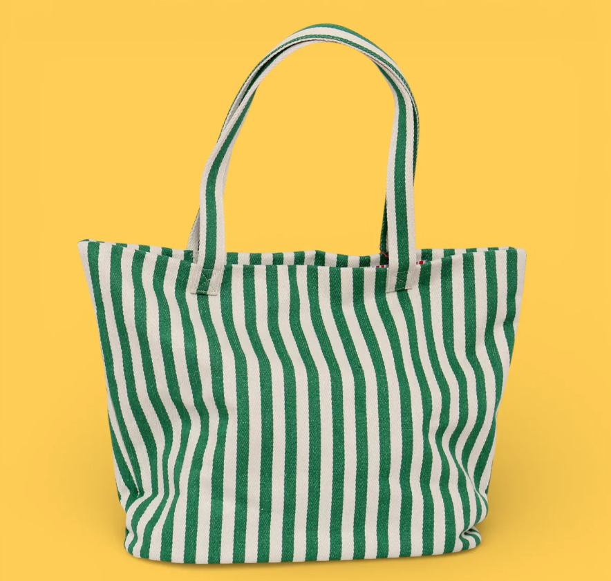 Bolsa tote de playa con diseño de rayas en tonos verdes. Perfecta para llevar tus esenciales de verano con estilo. Confeccionada con materiales resistentes y duraderos, ideal para días de sol y arena. Su amplio compartimento principal ofrece espacio suficiente para toallas, protector solar y accesorios de playa. Asas cómodas que facilitan el transporte. Un complemento versátil que combina funcionalidad y diseño, imprescindible en tu colección de verano.